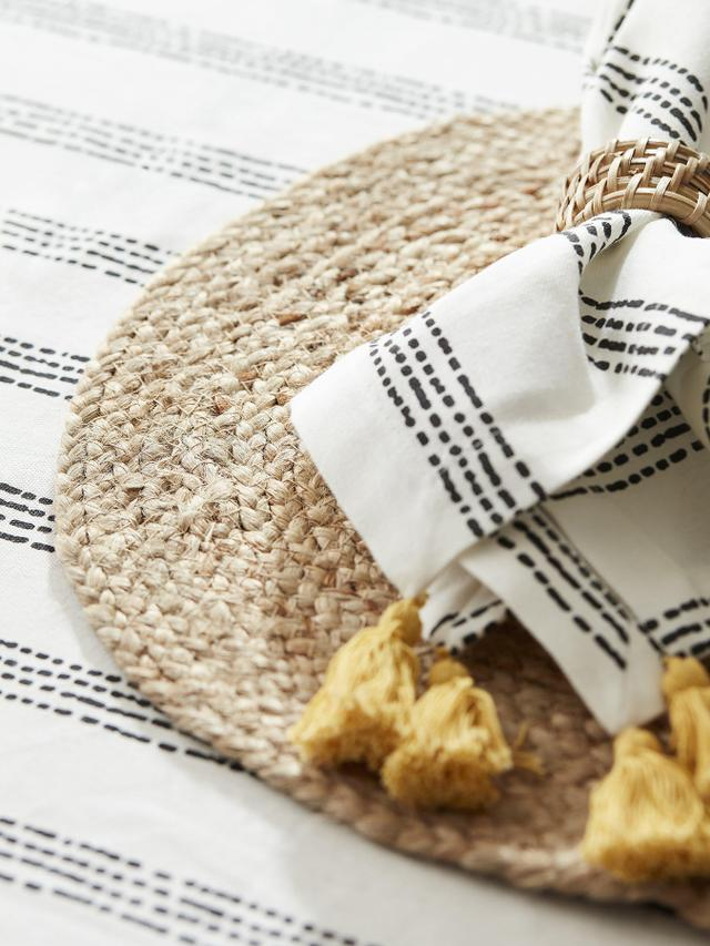 Rund bordstablett i flätad jute i mjuk kvalitet. Tabletten tvättas ej, torkas av med fuktig trasa.
