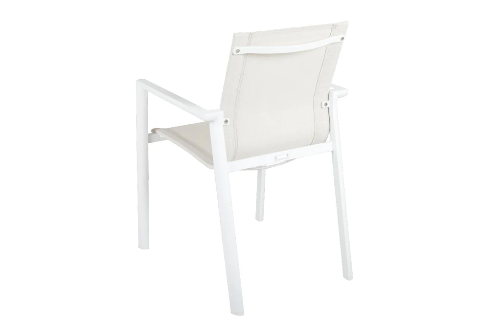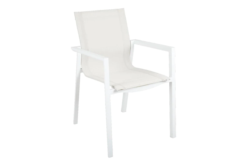 Karmstol Delia, en modern, lättplacerad stol med arm. I mattlackerad aluminium med sits i vit textilene. Stolen är stapelbar och därmed smidig att förvara. Från Brafab.