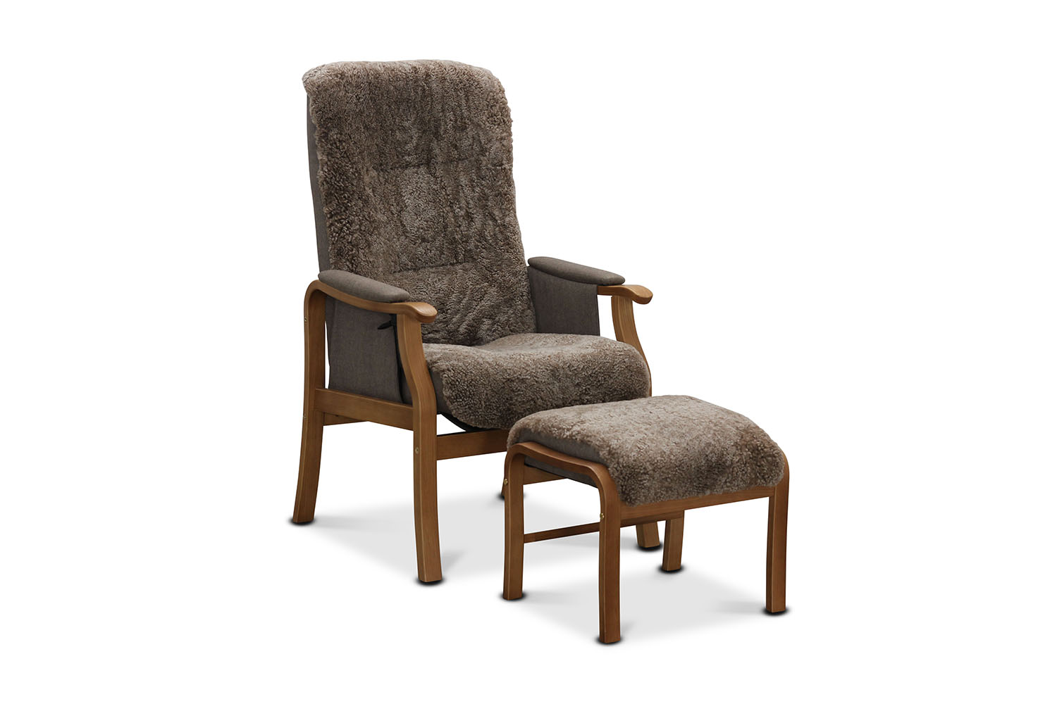 Bergen seniorfåtölj med fotpall i brunt fårskinn. Benen är i ek. Fåtöljen har en manuellt justerbar rygg. Tillhörande fotpall ger skön avlastning för ben och fötter.
