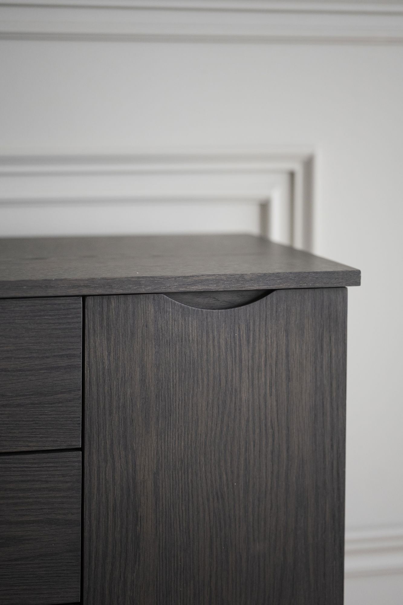 Filippa sideboard 122 cm med generös förvaring. Skänken består av mörkbrun lackad ekfaner samt massiv ek och har tre mjukstängande lådor och två luckor. Benen är lätt utställda vilket ger ett modernt uttryck. Sideboardet ingår i vår breda Filippa-serie som även har flera matchande matbord i olika storlekar.