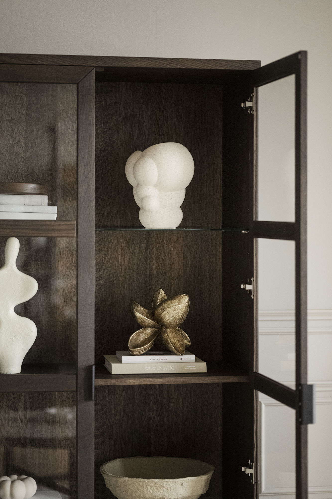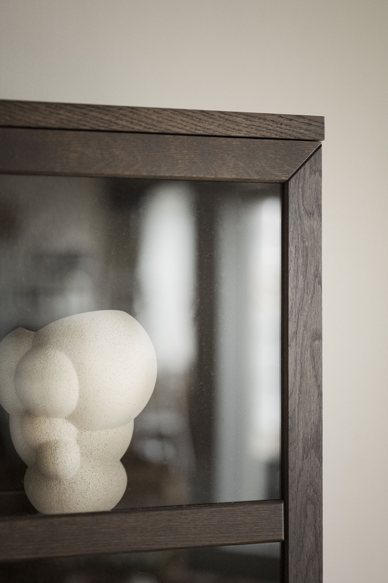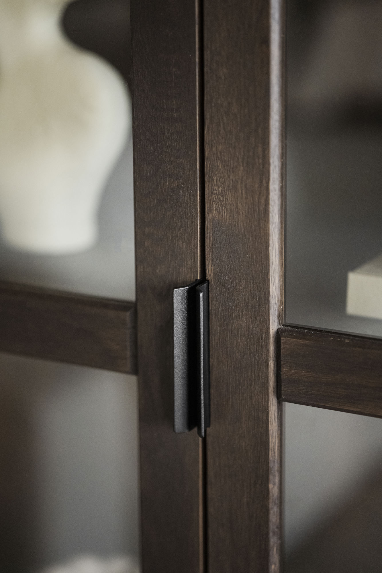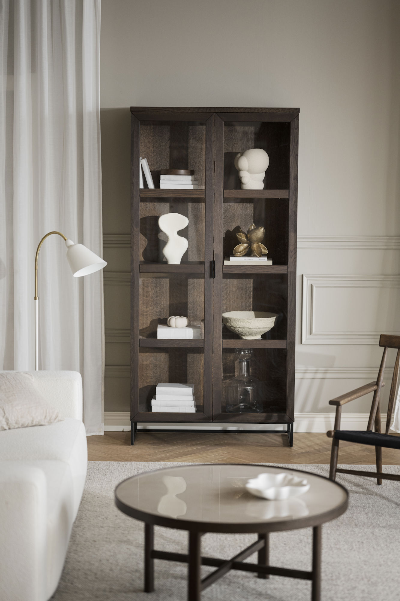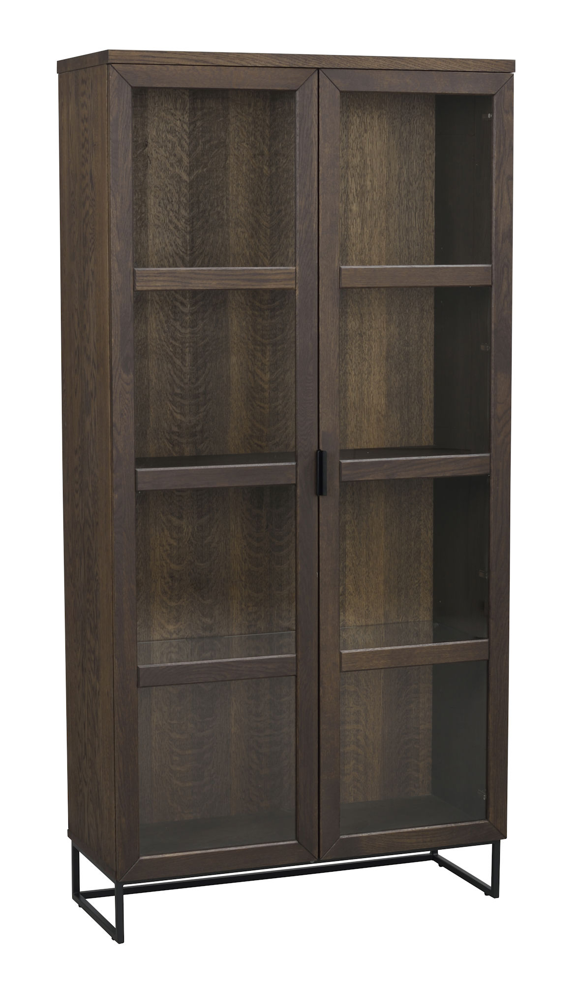 Everett vitrin i brunoljad massiv 100% FSC®-certifierad ek med svart metallunderrede samt handtag. Vitrinskåpet har glasdörrar och en modern borstad yta där kvistar kan förekomma och är med och bidrar till möbelns äkta träkänsla. Innanför dörrarna sitter tre hyllplan, varav två är flyttbara och dörrarna har mjukstängande soft-close funktion. Finns även i vitpigmenterad och svart.