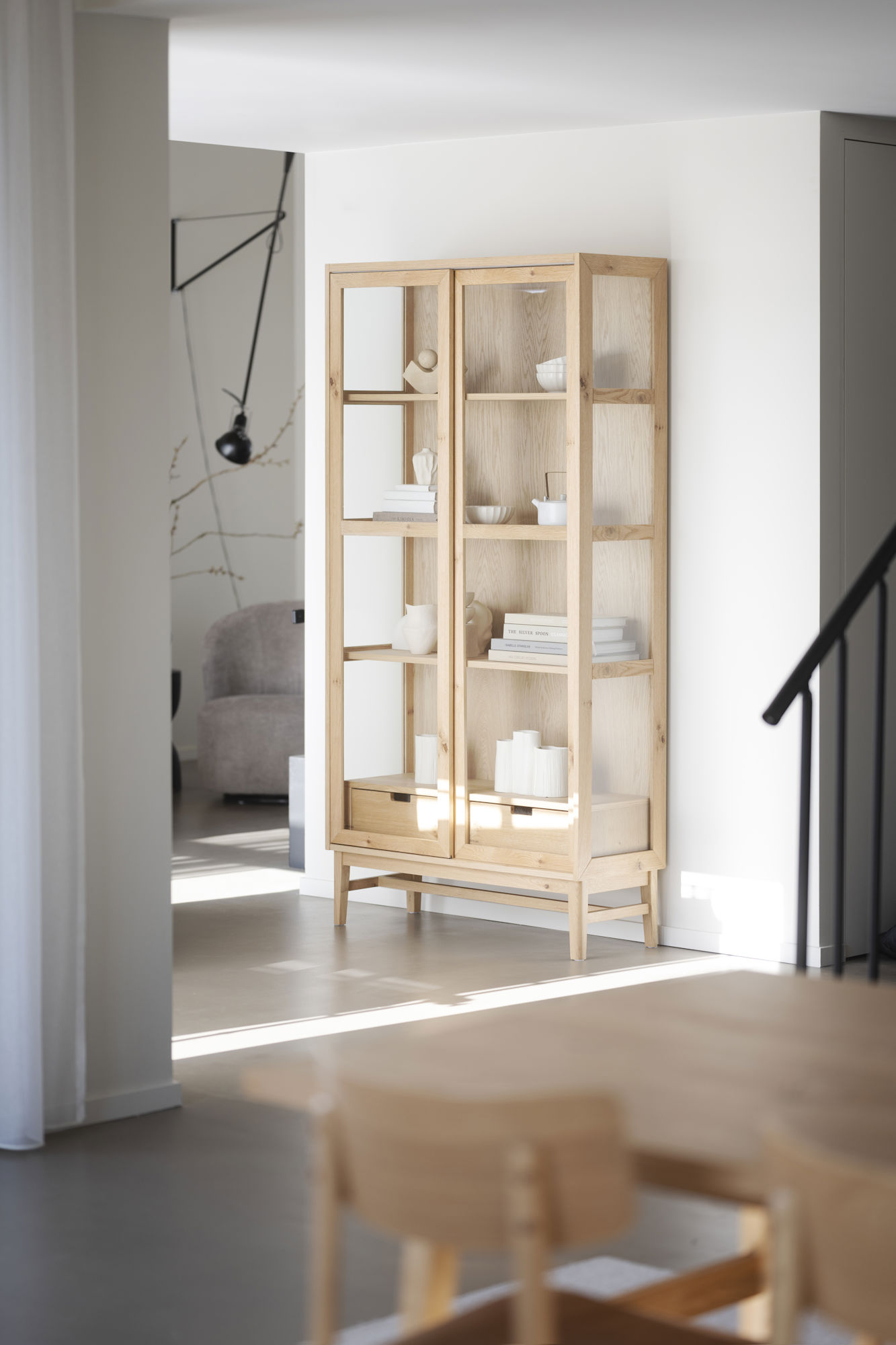 Hazelton vitrinskåp med stomme i oljad FSC®-certifierad ek och generöst ljusinsläpp från glaspartierna framifrån och på sidorna blir en imponerande möbel oavsett var i rummet den placeras. Det rymliga skåpet har praktiska skjutdörrar, tre fasta hyllplan samt två mjukstängande förvaringslådor längst ner för extra utrymme. Perfekt för att visa upp glas, böcker eller inredningsdetaljer men ändå kunna gömma undan vissa vardagsartiklar. Kombinera gärna med Hazelton sideboard i samma färg eller Plainfield matbord med matchande bordsben för en enhetlig stil. Finns även i brunoljad ek.