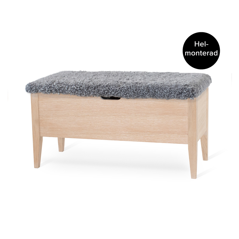 Välj mellan olika klädslar på toppen – grå fårskinnsimitation, äkta fårskinn, ljusgråa tyget Chelsea eller bruna tyget Abriamo. På insidan av bänken finns ett rymligt fack med en praktisk skiljevägg, som även går att tas bort för att göra plats för större föremål.
