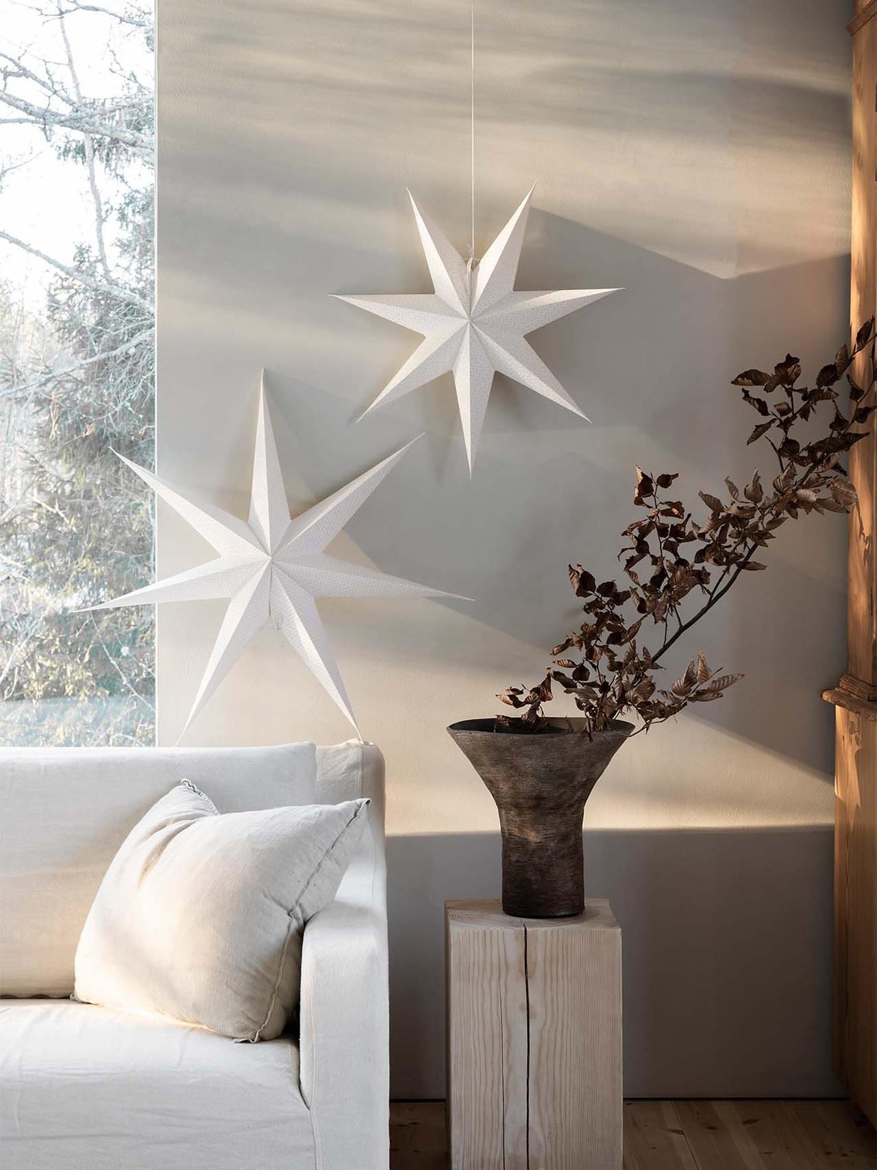 Aino 80 är en adventsstjärna i papper, täckt av små hål som ger den ett magiskt skimmer när den är tänd. Låt den lysa upp ditt fönster, och skapa en stämningsfull julkänsla under mörka vinterkvällar. Likt våra övriga stjärnor är Aino vikt och limmad för hand
