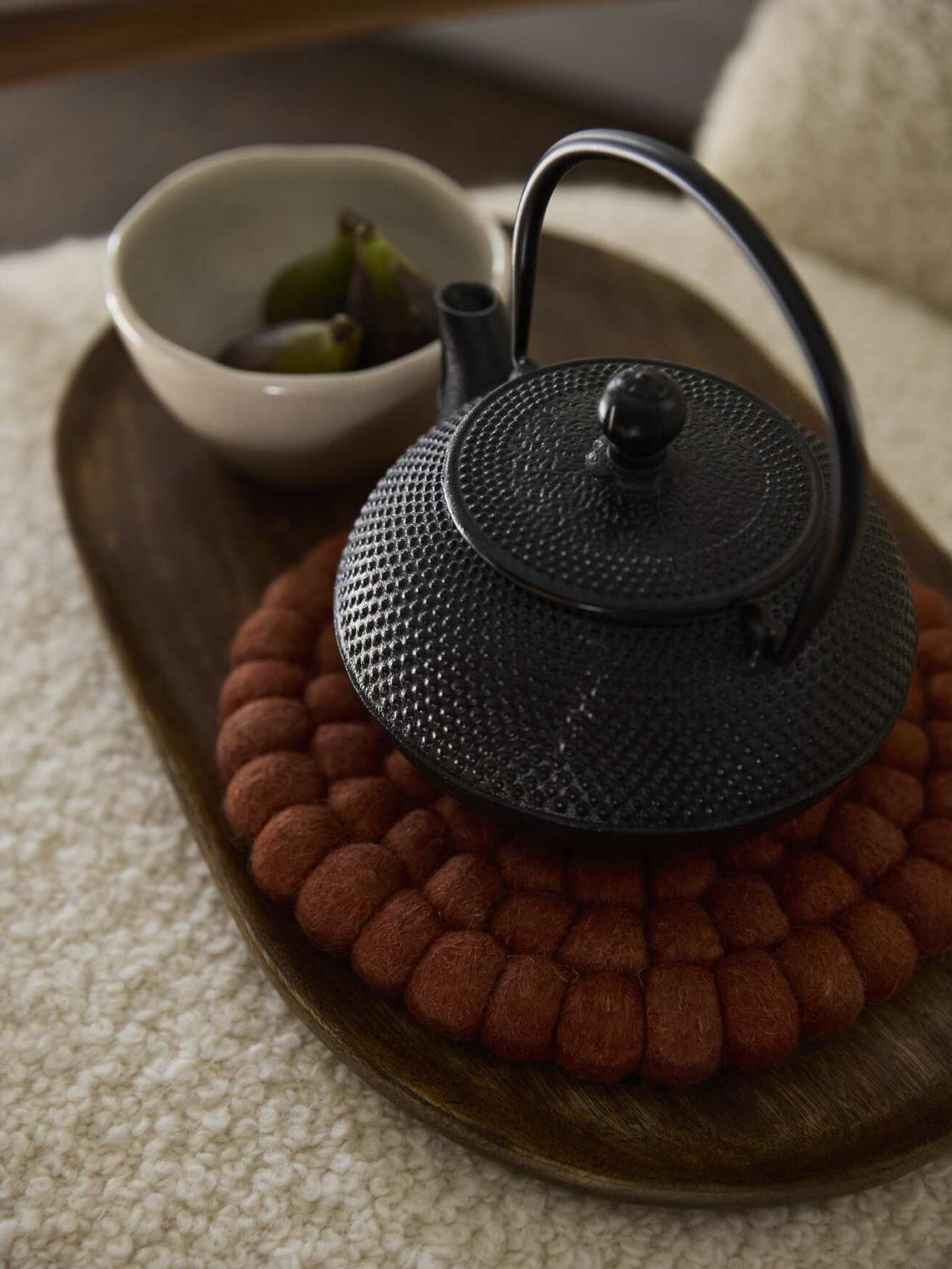 Grytunderlägg i ull med tovade bollar, för att skydda bordet mot varma kärl.