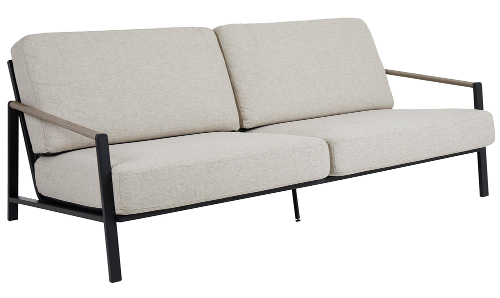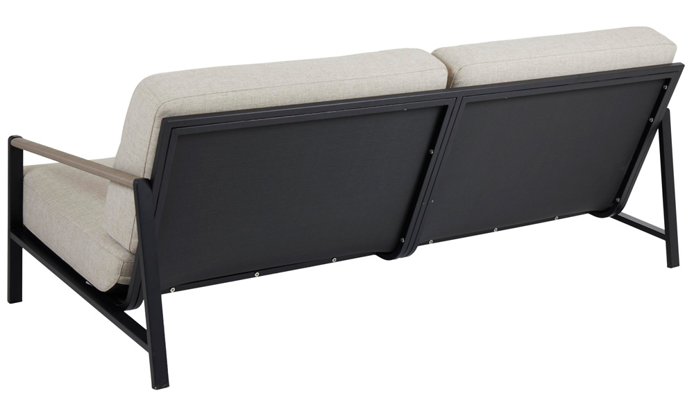 Modellen är oerhört bekväm tack vare de tjocka dynorna med högdensitetsskum. De är klädda med fodrat olefintyg som har en vattenavvisande beläggning på insidan. Stommen består av svart pulverlackerat rostfritt stål med vackra detaljer av konstrotting på armstöden.