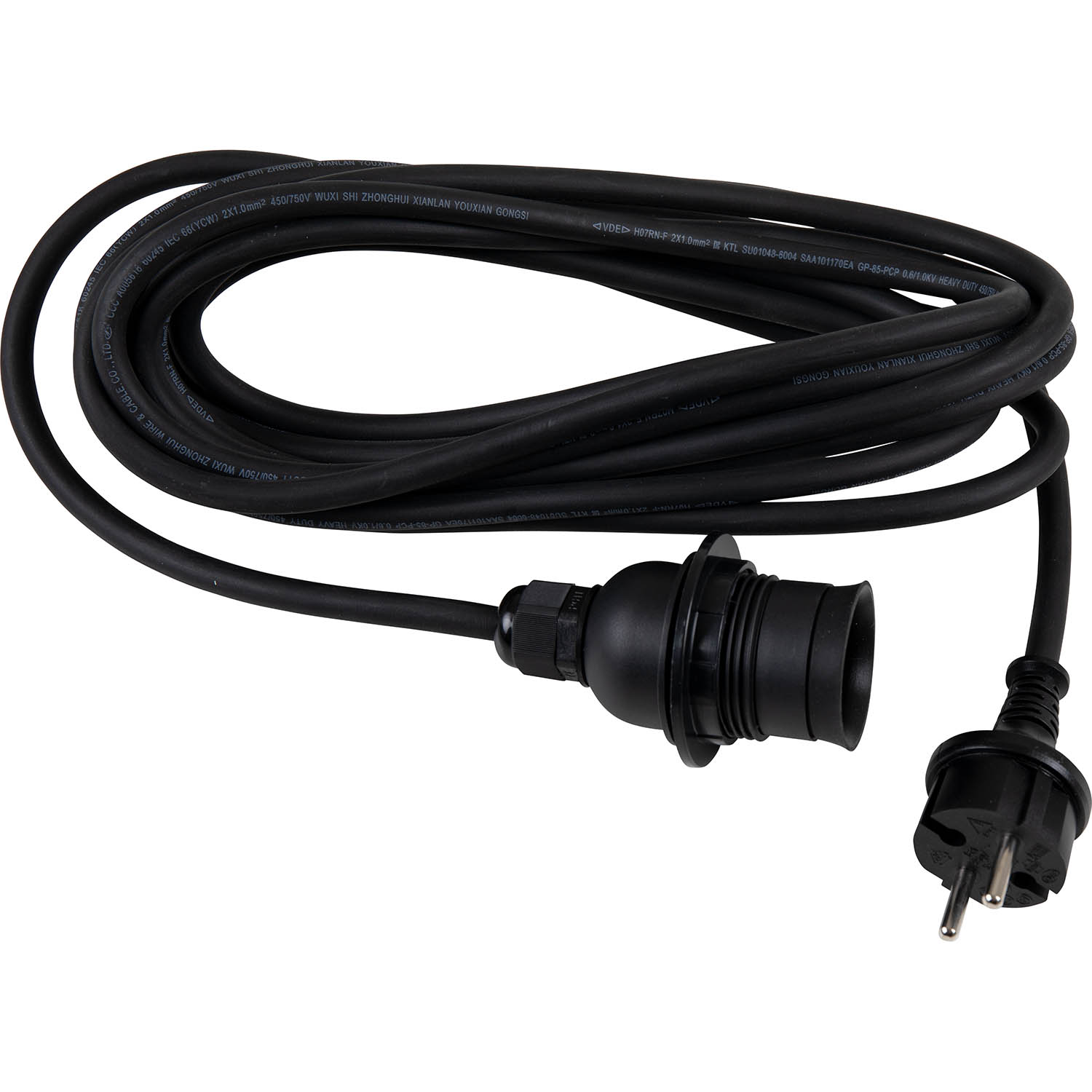 Ett väderbeständigt sladdset , med 5 meter sladd, för utomhusbruk IP 44 med E27 lamphållare för ljuskällor med max effekt 15W. Komplettera med valfri lampskärm och ljuskälla. EU-godkänd.