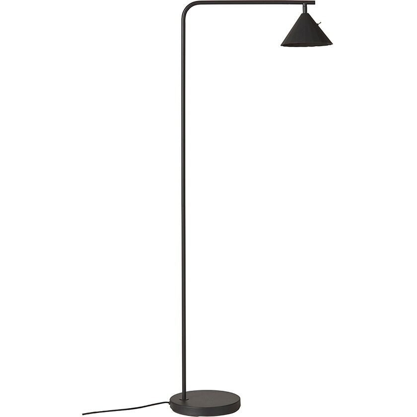 Stilfull golvlampa från CO Bankeryd. Tillverkad i metall med en mattsvart finish som ger lampan en modern och stilren känsla. En läckert böjd lampfot och en konisk lampskärm med brytare på skärmen, svart sladd i PVC.