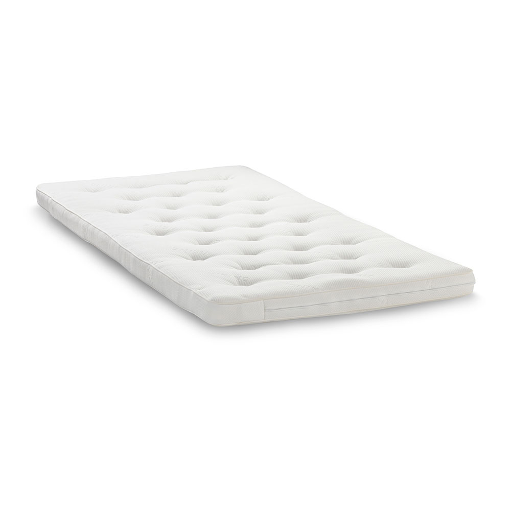 2 cm 4-kanals spiralkrusad fibervadd på både översidan och på undersidan vilket kanaliserar bort fukt och värme. 3 cm högelastisk ventilerande Pulselatex, 65 kg/m³ med 50% naturlatex. Bra att veta: det kan vara ner mot 7% naturlatex i billigare bäddmadrasser. Bäddmadrassen har en skön ytmjukhet och behaglig känsla tack vare den lyxig bomullsstretchen närmast kroppen. Pulselatex har även goda ventilerande egenskaper. Den höga kvalitén gör även att den har en mycket bra livslängd och inte tappar spänsten. Tillverkas i vår fabrik i Ekenässjön. Finns även i utförande Flex, för ställbara sängar. Då är det en slits uppe och nere som skapar komfort och flexibilitet. Säljs endast i vitt. Pikerad.