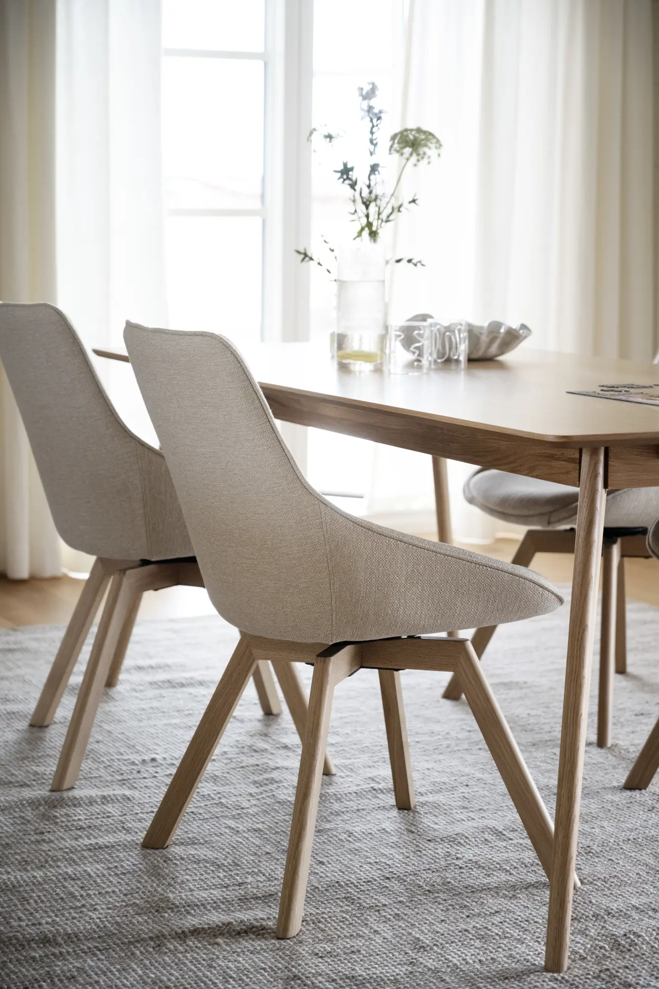 Populära Alison stol med träunderrede och snurrfunktion. Här syns den i ett tåligt ljusbeige tyg och med ben i lackad brun ek. Alison har en stoppad sits med hög sittkomfort i kupad design och ben med snurrfunktion i 360 grader. Stolen passar perfekt runt matbordet men även som udda stol till skrivbordet. Alison är FSC®-certifierad och finns även i andra jordnära färger.