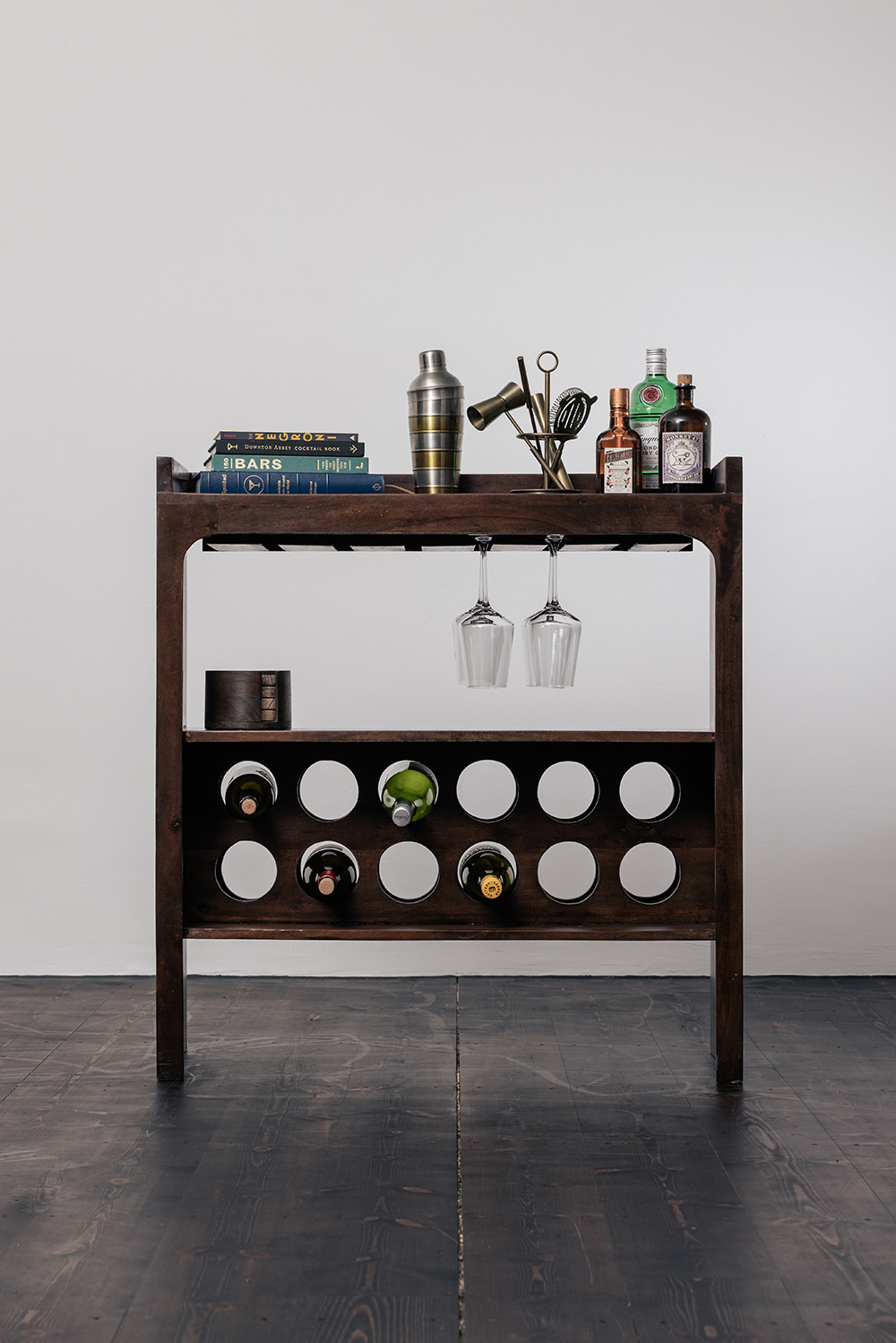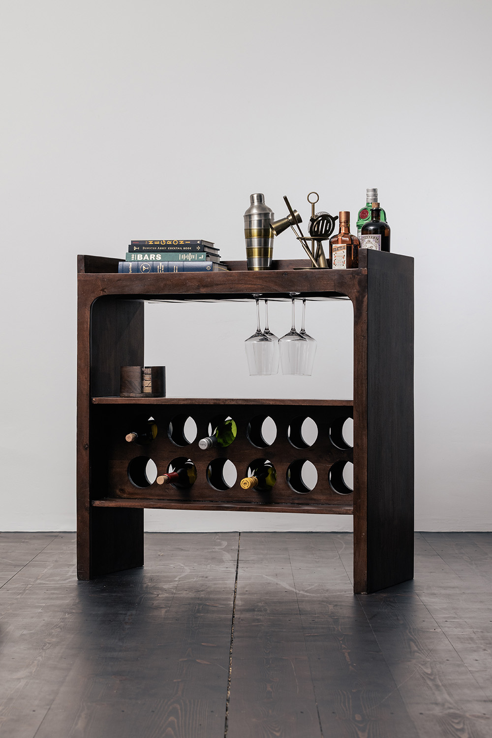 Seattle sidetable i mörk brun med både förvaring för glas och flaskor. Tillverkad i Akacia.