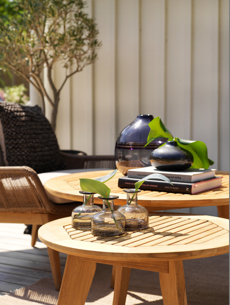 Kastos soffbord i teak med diametern 90 cm, bordet finns även i en mindre variant med diametern 60 cm. Fungerar lika bra som sidobord som satsbord i kombination med det mindre.