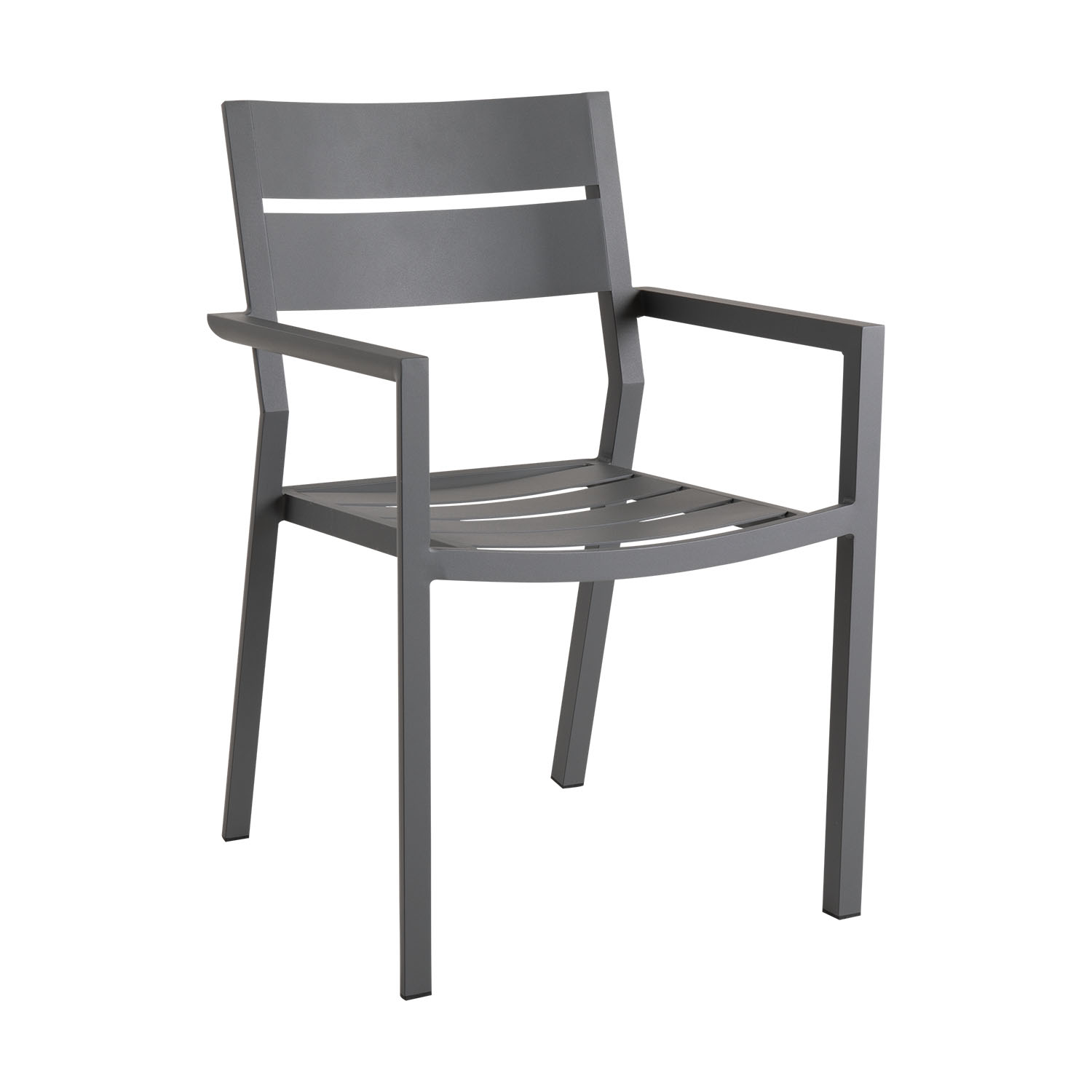 Karmstol Delia, en modern, lättplacerad stol med arm. I mattlackerad aluminium. Stolen är stapelbar och därmed smidig att förvara. Från Brafab.