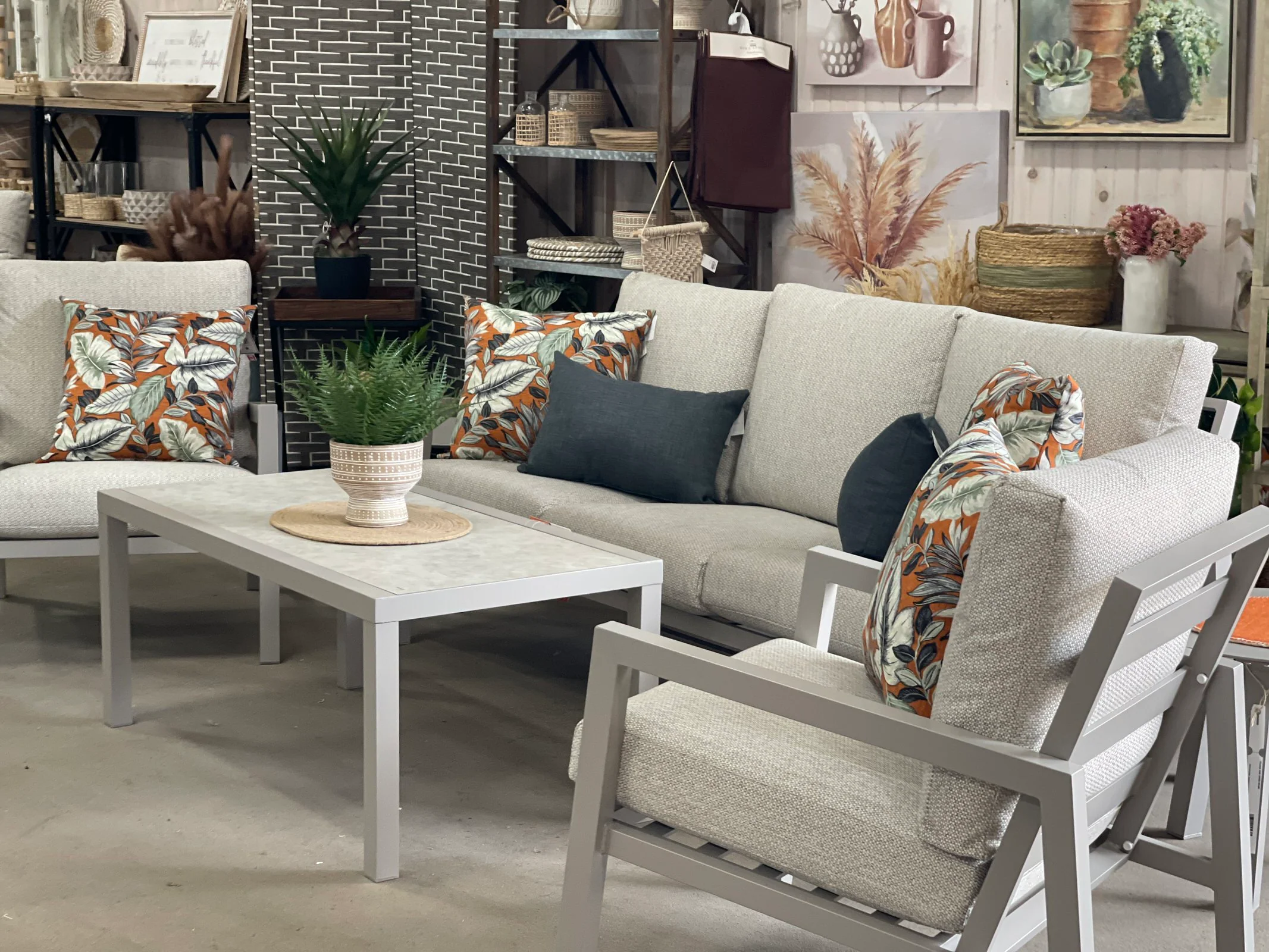 Garda är en nätt och fin soffgrupp i khaki kraftig aluminium. Rejäla allvädersdynor i beige ingår. Gruppen består av en 3-sits, två fåtöljer och ett bord.