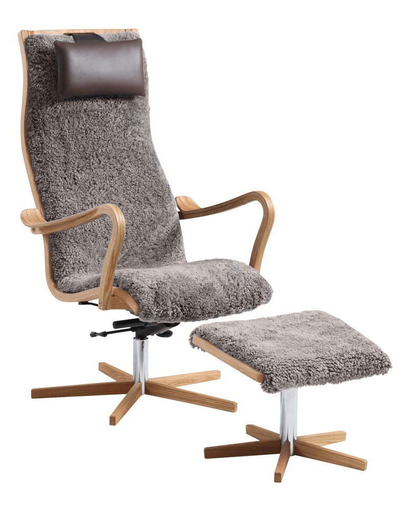 Furiren fårskinnsfåtölj och fotpall från småländska Bröderna Anderssons. Furiren är en nätt och elegant fåtölj med mycket god sittkomfort, i en tidlös svensk design. Fåtöljen har skön snurr- och gungfunktion som enkelt kan låsas i önskat läge. Både fåtöljen och pallen är tillverkade i formpressad oljad ek, klädd i fårskinn med en nackkudde i svart skinn. Snurrunderredet är i en nätt design och kombinerar metall/trä på ett smakfullt sätt. Denna modell har extra stoppning mellan fårskinn och linneväv för bästa känslan.