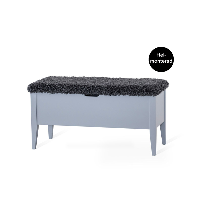 Välj mellan olika klädslar på toppen – grå fårskinnsimitation, äkta fårskinn, ljusgråa tyget Chelsea eller bruna tyget Abriamo. På insidan av bänken finns ett rymligt fack med en praktisk skiljevägg, som även går att tas bort för att göra plats för större föremål.