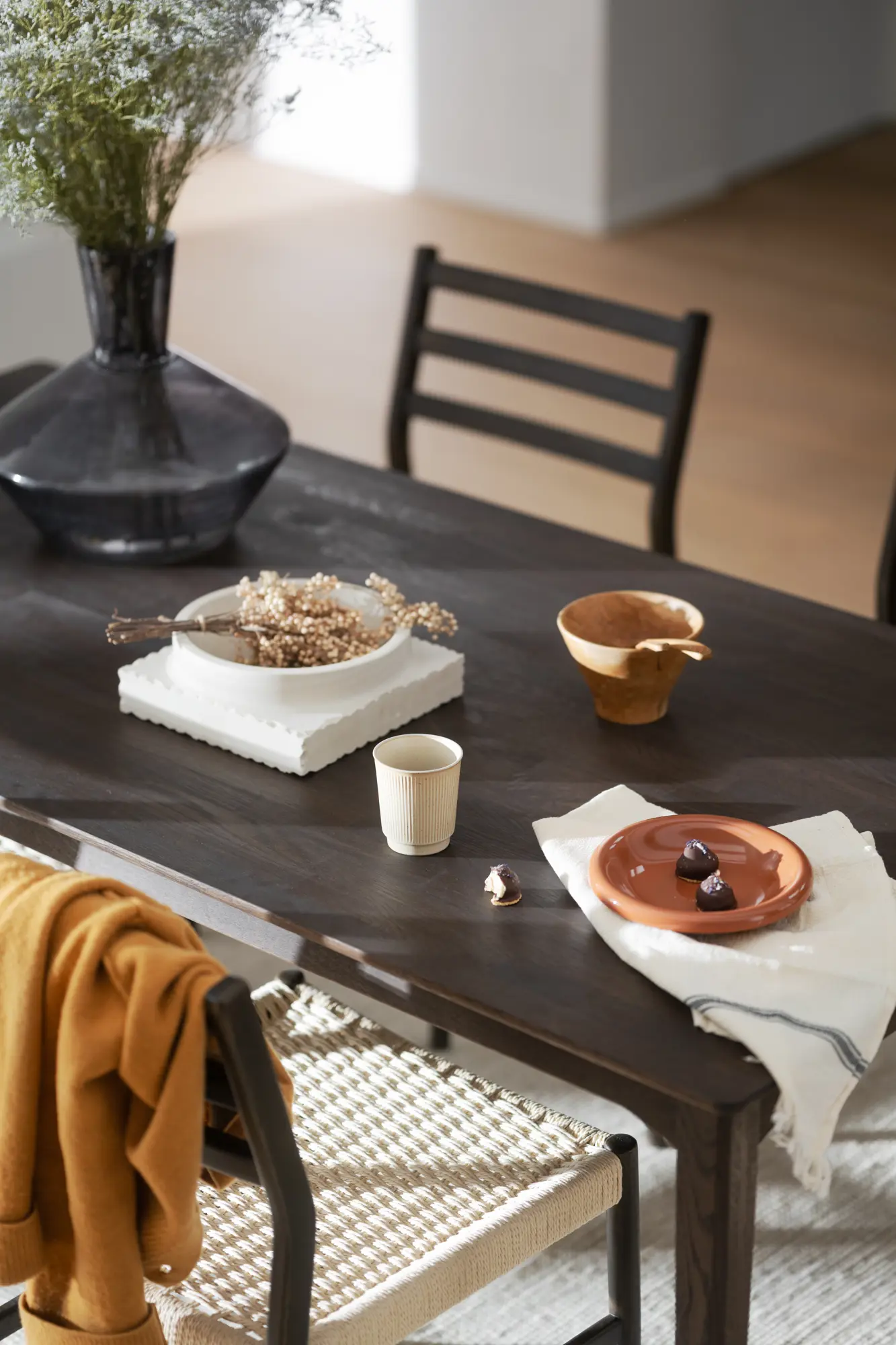 Matbordet har blivit behandlat med Rubio Monocoat som ger en tålig yta och står emot slitage väl. Detta innebär att bordet inte behöver ytterligare behandling innan användning. För att bevara bordets skönhet rekommenderar vi i stället regelbundet underhåll med RUBIO Surface Care för effektiv rengöring av fläckar (vid behov) samt RUBIO Refresh Eco för uppfräschning av träytan (vid behov, upp till 4 ggr per år). Mer information finns i skötselrådet.