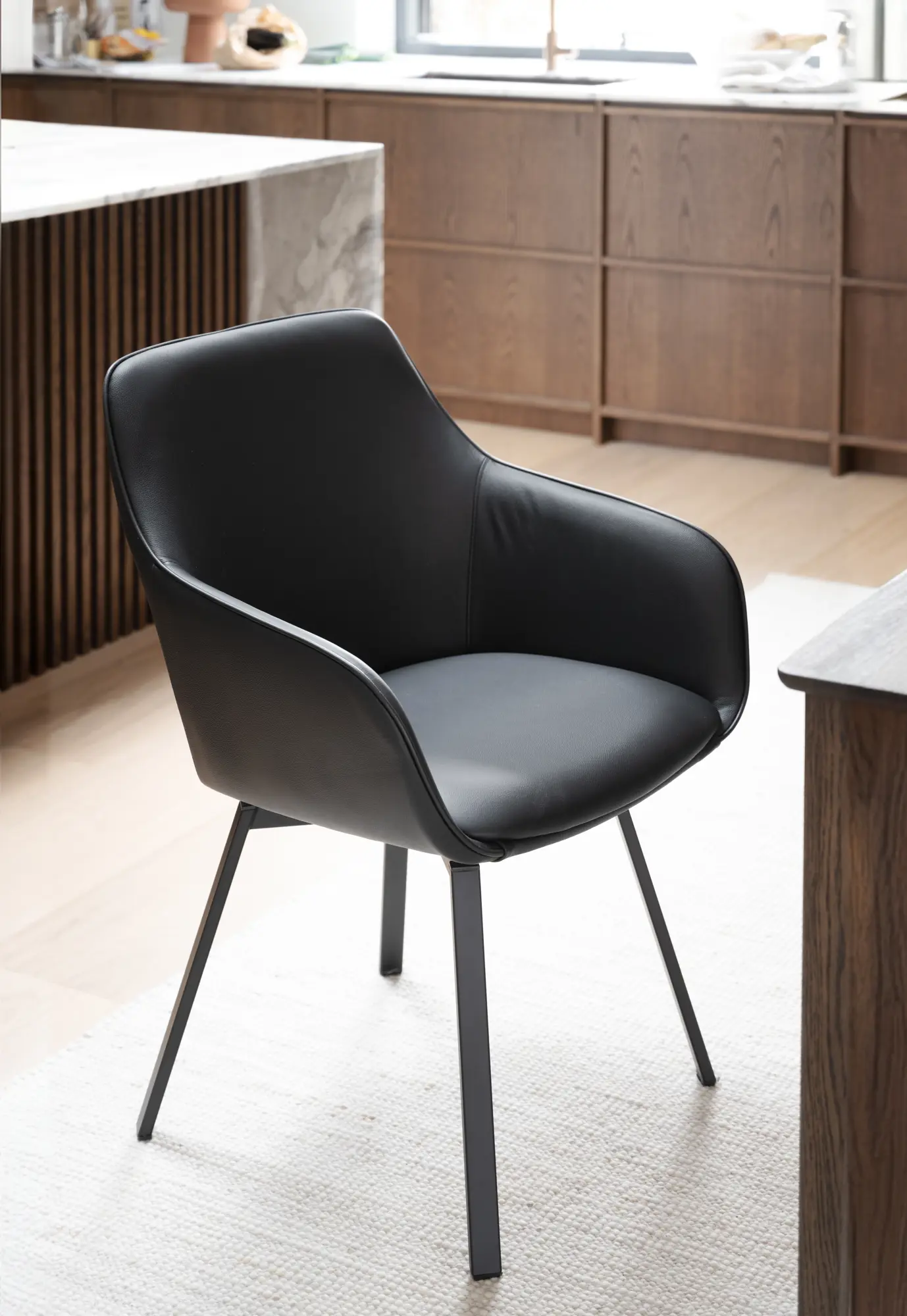 Alison karmstol i svart läder har precis som populära Alison stol ett snurrbart underrede i 360 grader. Den kupade stoppade sitsen och de höga armstöden gör stolen bekväm och ombonad att sitta i. Alison karmstol med svart metallunderrede gör det lätt att matcha karmstolen med andra möbler i hemmet. Träet inuti sitsen består av 100 % FSC®-certifierat trä. Säljs endast i 2-pack. Sits i plywood med polyeterskum stoppning, äkta läder, ben i pulverlackad metall med snurrfunktion.