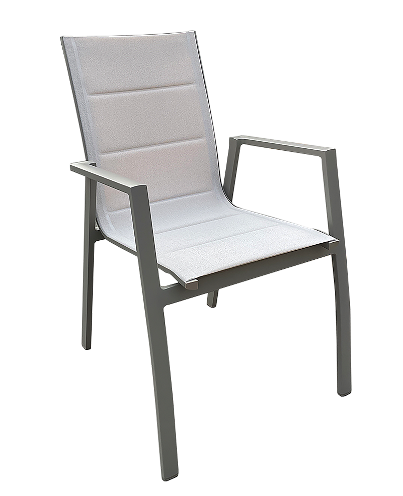 Nätt karmstol i aluminium med sits stoppad med QuickDry-skum. Stapelbar karmstol med beige sits och stomme i färgen khaki.