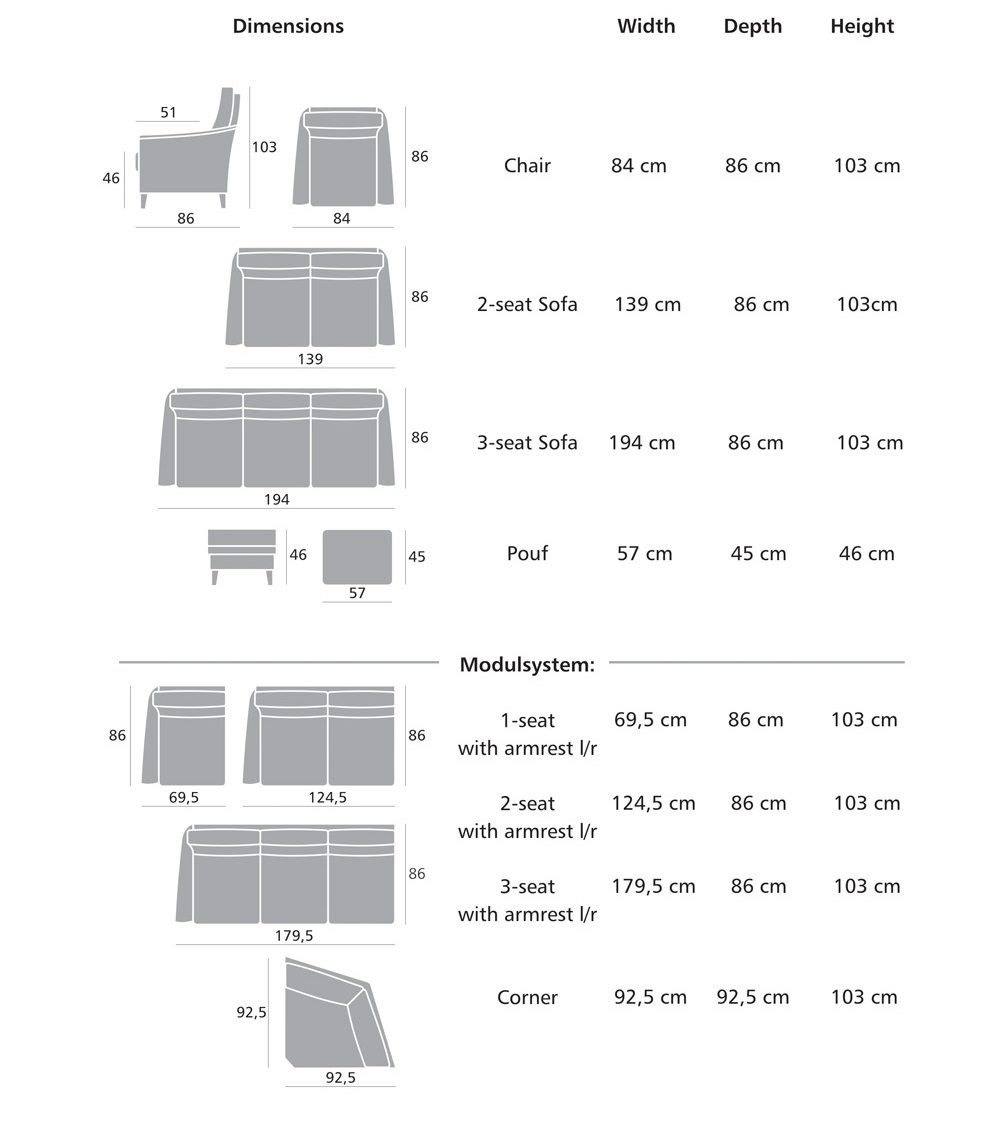 Stomme i massivt trä, fast sittdyna i 35 kg kallskum även ryggdynan är fast och har en kärna på 25 kg kallskum.