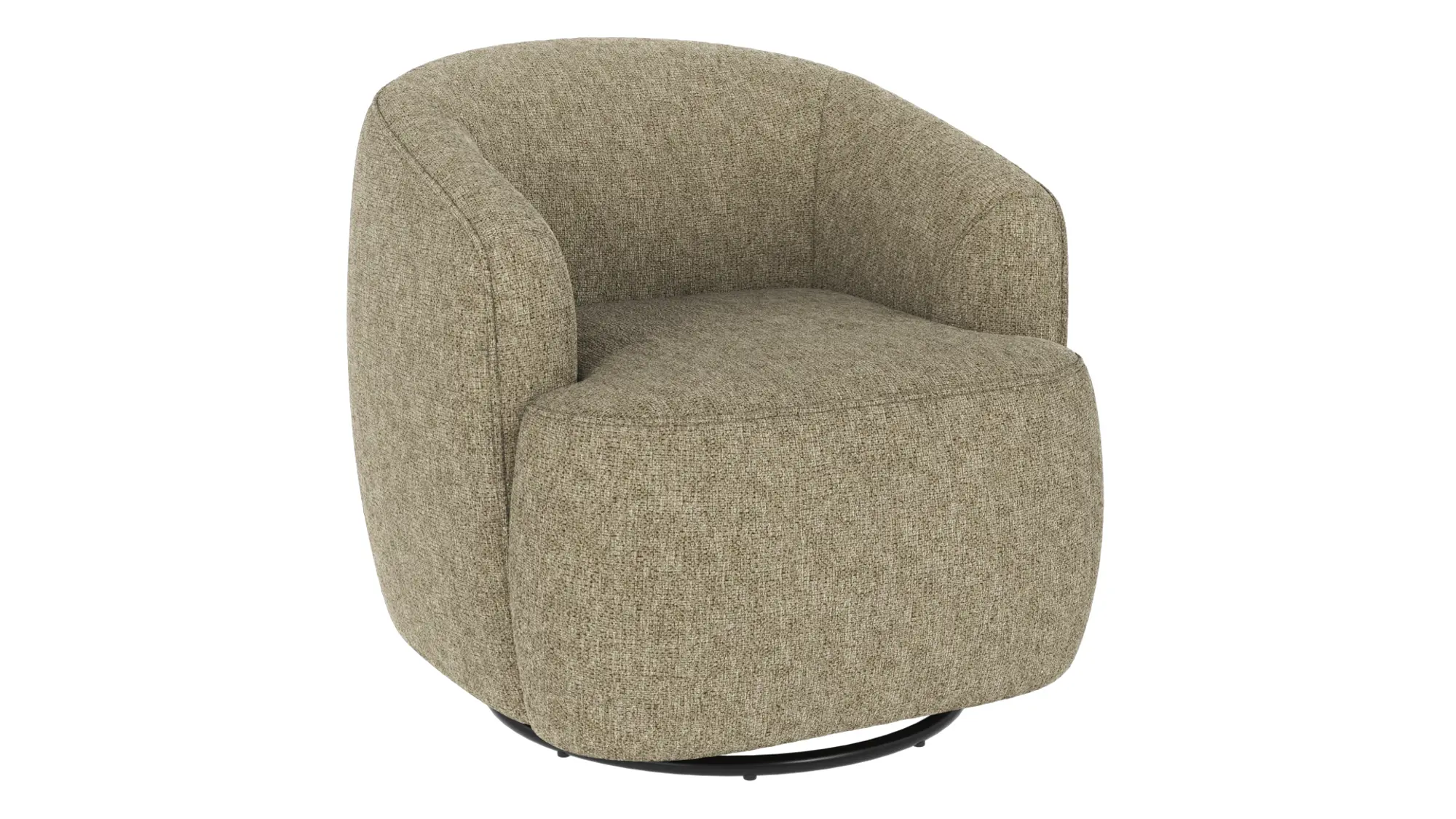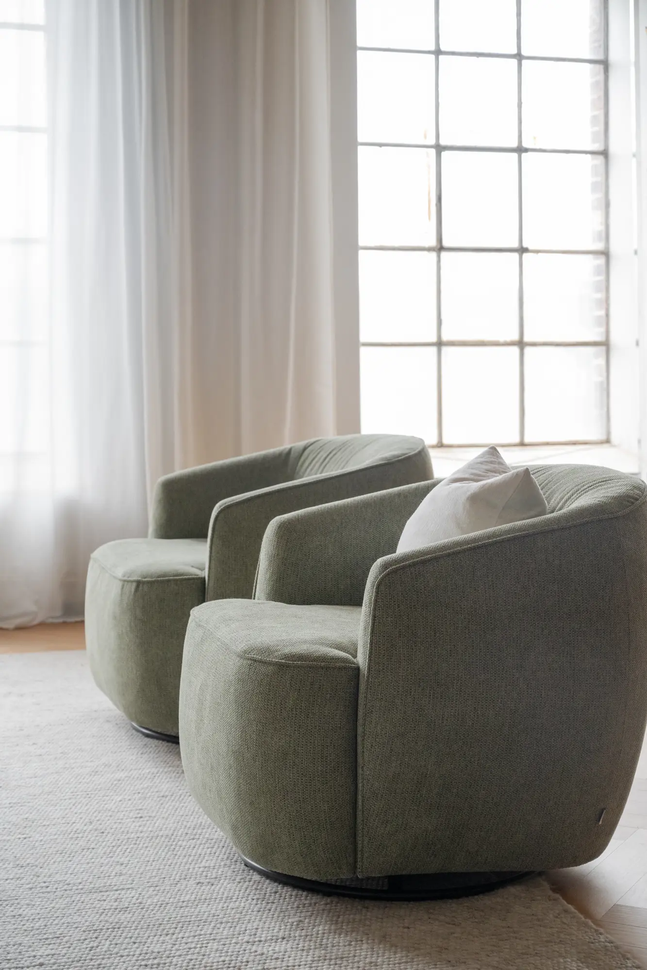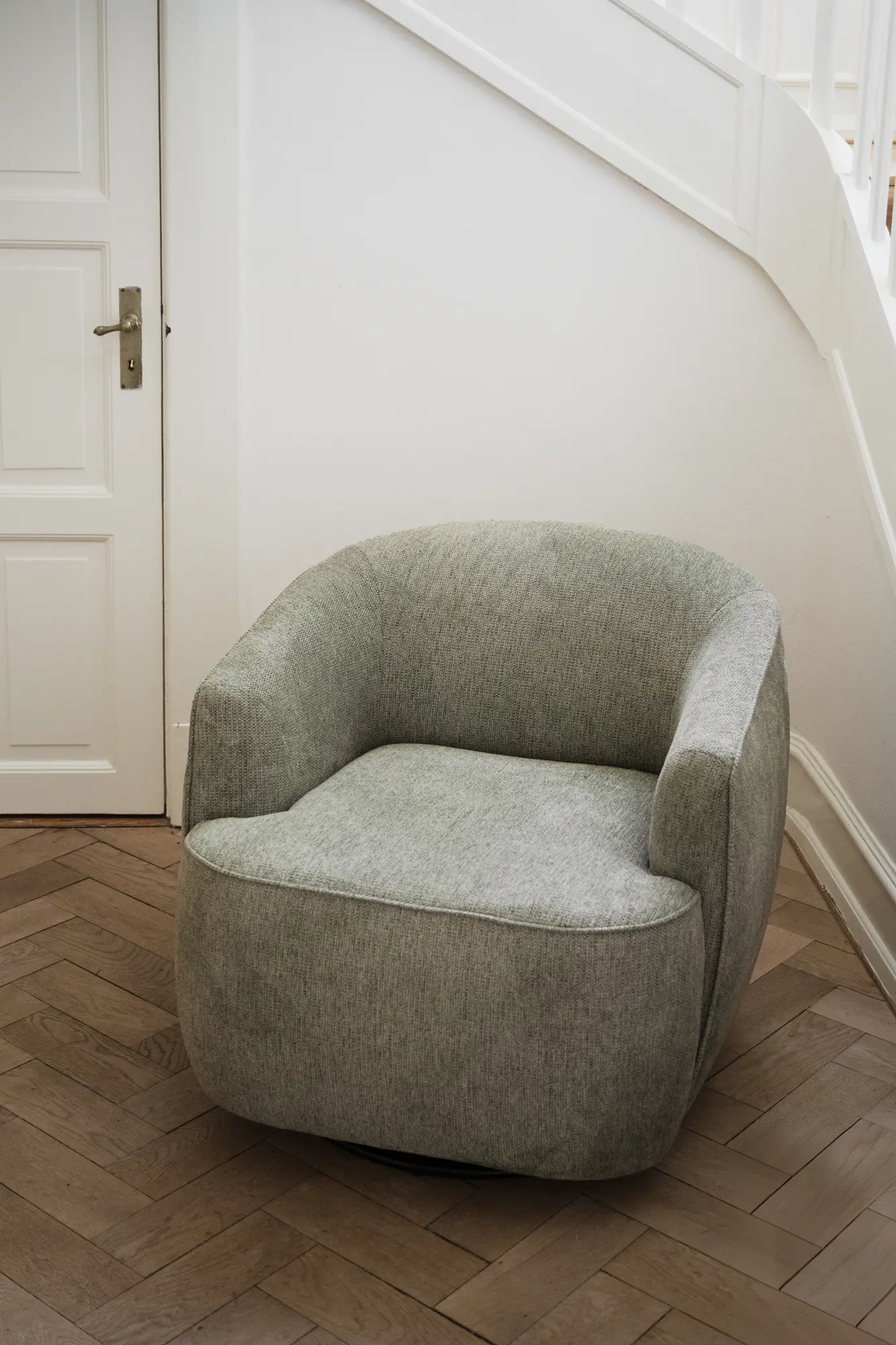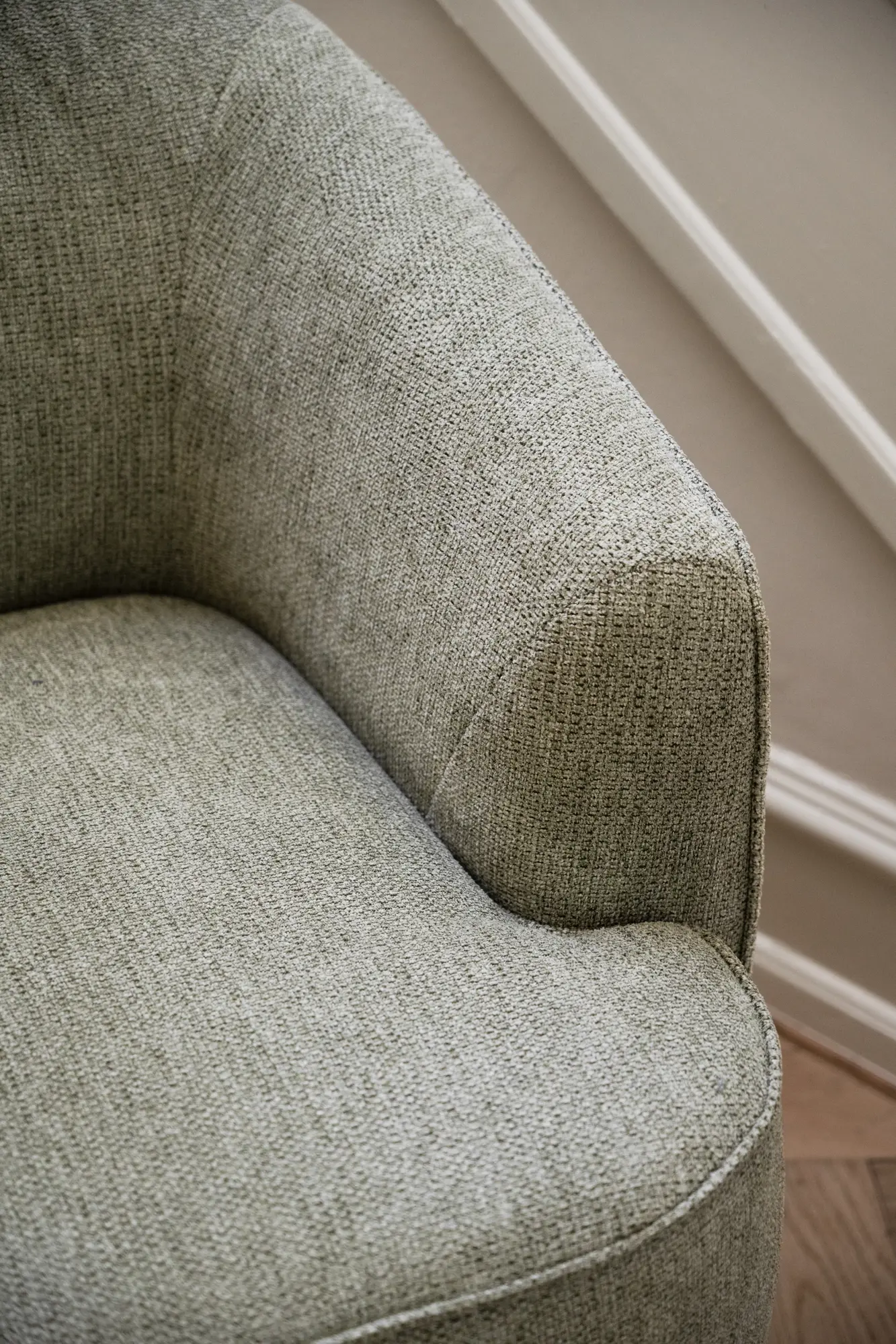Dermot fåtölj Max #55 grön är en stoppad fåtölj med mjuka, runda former och dekorativa textilsömmar. Fåtöljen erbjuder en fantastisk sittkomfort och har en 360-graders snurr- samt gungfunktion. Dermot finns även med fasta ben utan snurr- och gungfunktionen.