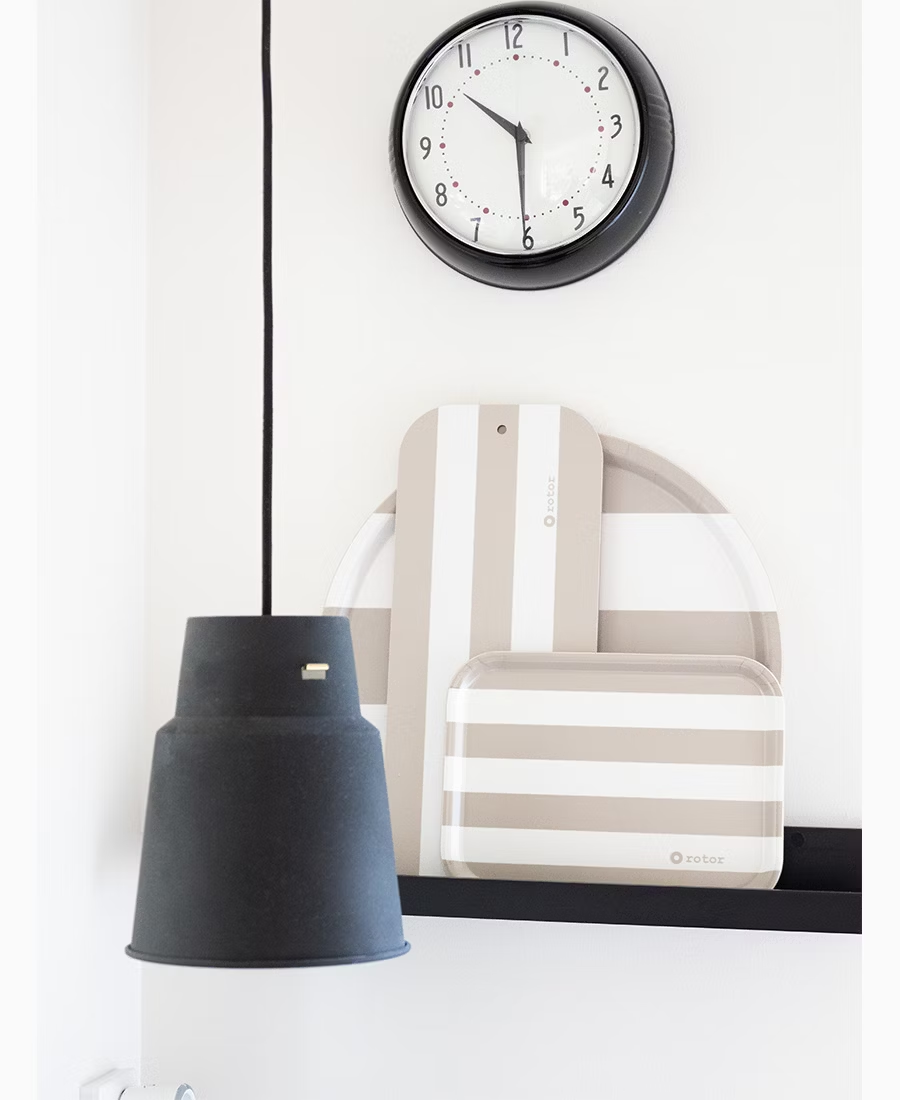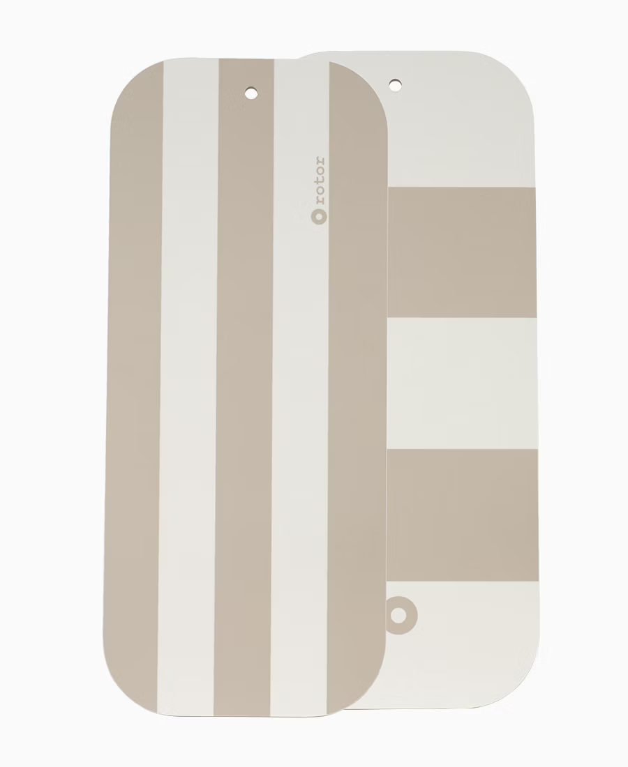 En väldigt fin skärbräda som även funkar utmärkt som serveringsbricka. Vändbar med ränder på olika håll på fram och baksidan. "Stripes-blond by rotor" (beige/vit).