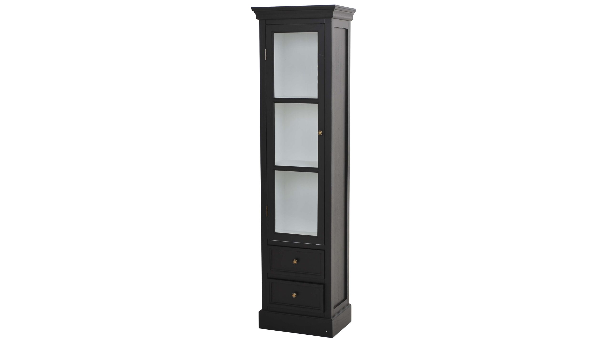 Nätt vitrinskåp i lantlig stil med antiksvart finish. Skåpet har vit insida och är handgjort för att få en snyggt antik look. Med två lådor fasta fyllplan, två lådor och glasdörr.