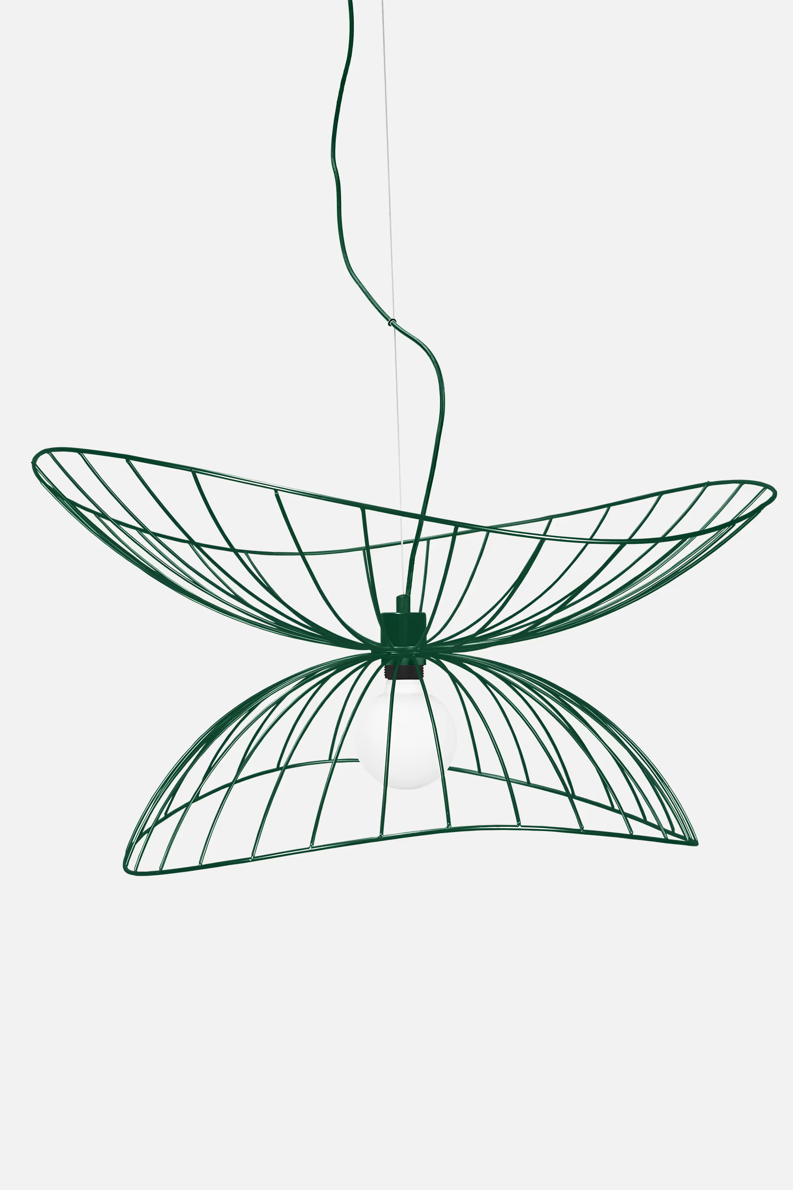 Ray är en mjuk och minimalistisk lampa tillverkad av metall i en mattgrön kulör. Välj själv hur du vill att taklampans design ska se ut, du kan arrangera de två skärmarna, ovanpå- eller inuti varandra för att få en lägre pendel. Lampan har en 120 cm lång matchande grön textilkabel med vajer samt matchande takkopp gjord av metall, kronkoppling för takanslutning medföljer ej.