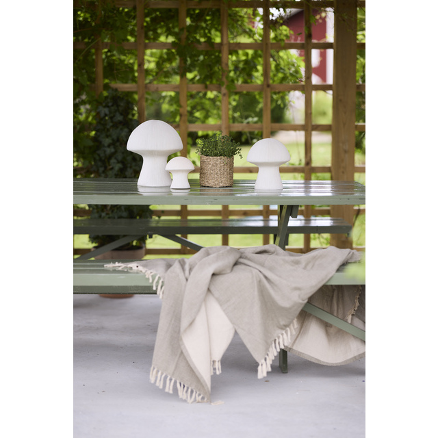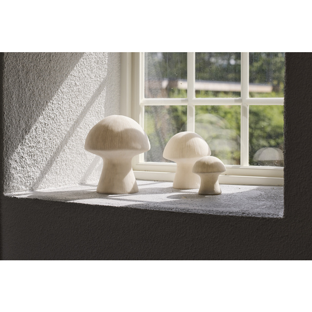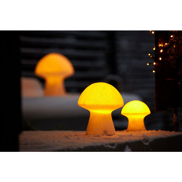 Dekorativ lampa i form av en svamp. Tillverkad i sten och drivs med batterier. Har en timer på 6 timmar och kan användas både ute och inne.