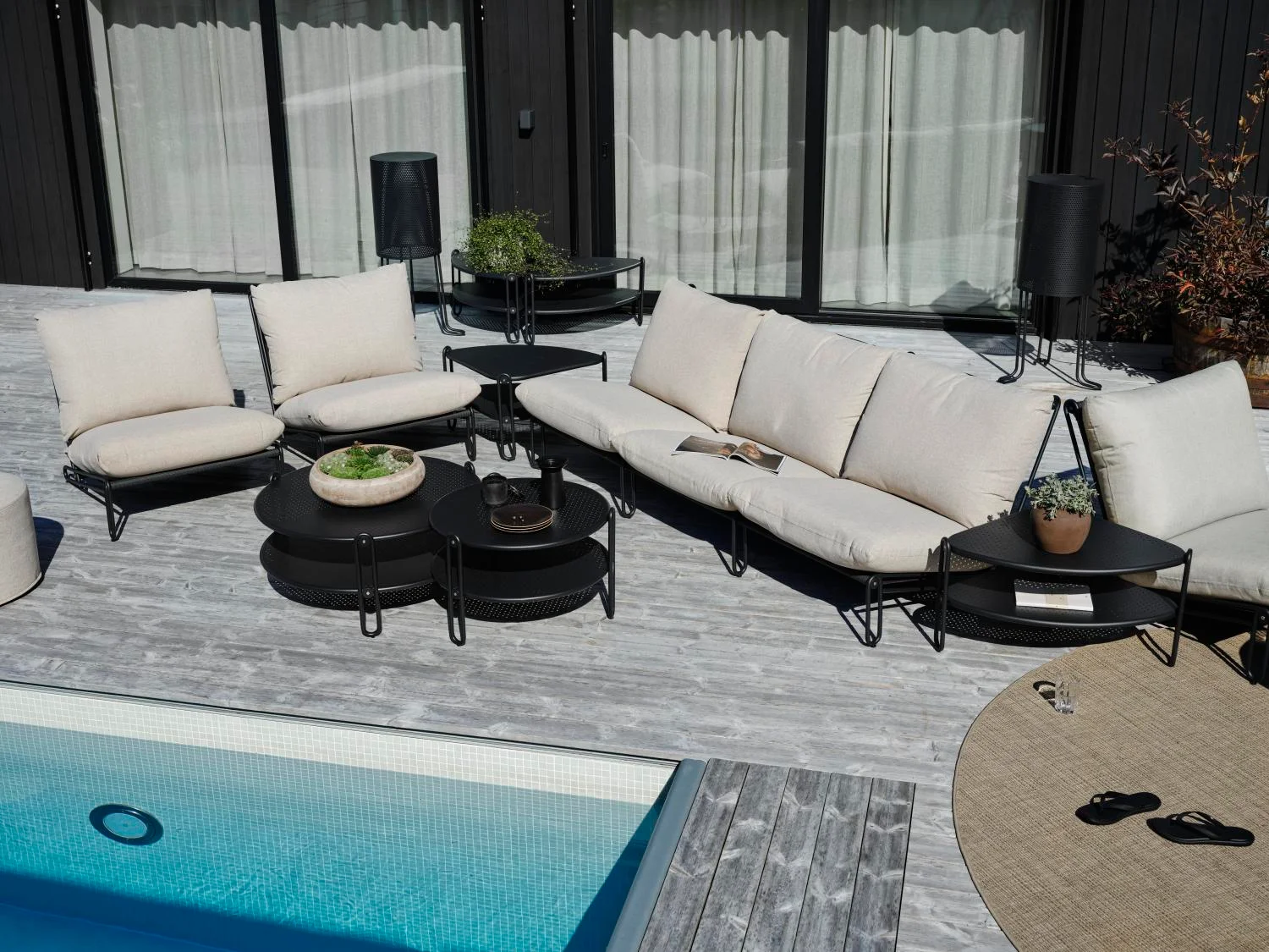 En skön loungefåtölj som sticker ut. Vinklarna och de öppna stommarna i aluminium skapar en klockren plats att koppla av på. Dynorna finns i rosa, grå och beige och är alla klädda i vattenavvisande olefintyg. De här fåtöljerna står bra för sig själva – men tillsammans med Blixt sittdel kan de byggas ut till soffa.