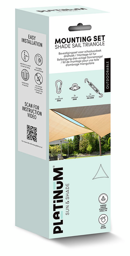 En komplett Platinum Sun & Shade monteringssats för enkel montering av ett triangulärt skuggsegel. Innan du monterar solseglet är det viktigt att först bestämma exakt var seglet ska placeras. Sedan monterar du öglorna på rätt plats på väggen eller stolpen. Genom att använda karbinhaken och vantskruven kan du hänga seglet tätt och det sitter fast ordentligt. Platinum Sun & Shade monteringsmaterial är tillverkade av högkvalitativt nautiskt rostfritt stål 316.