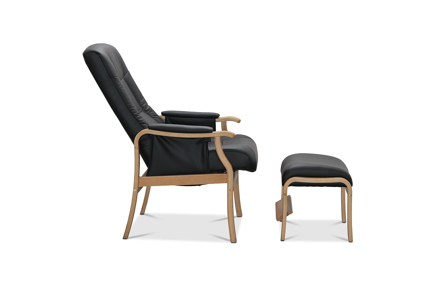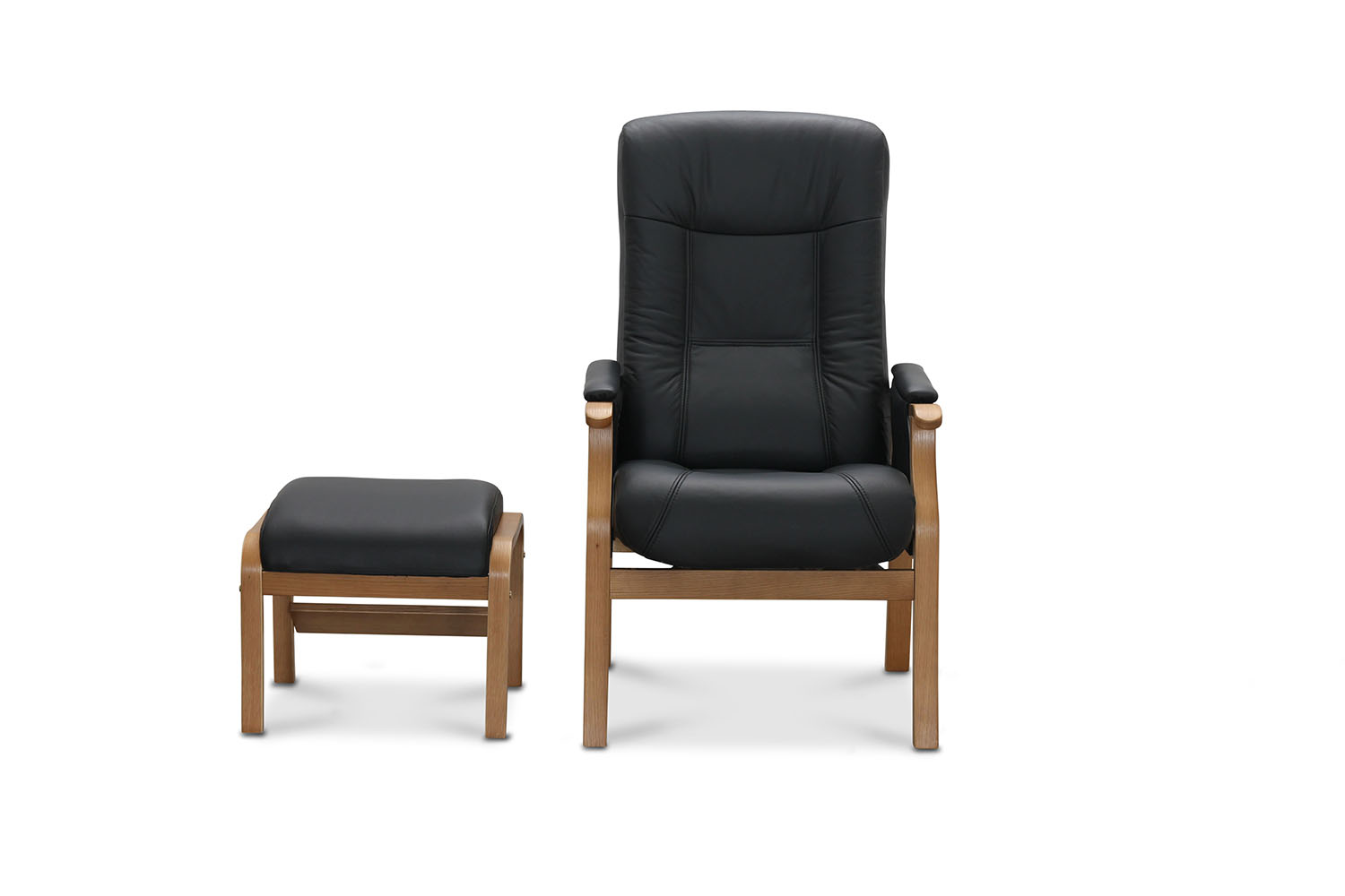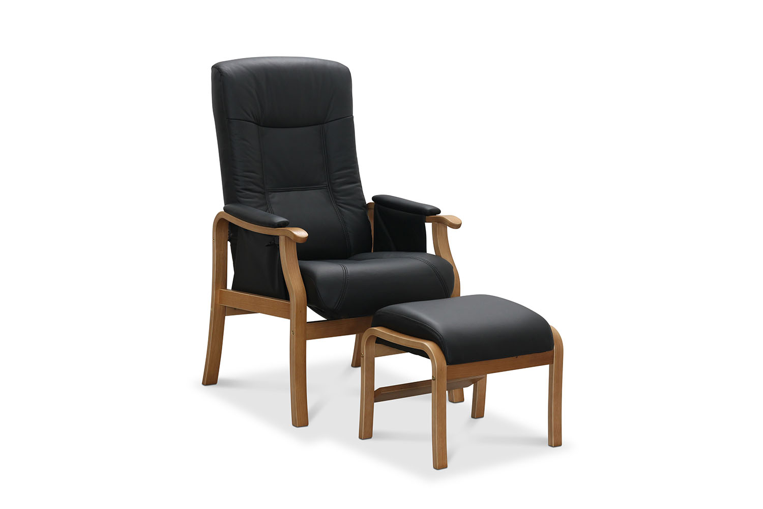 Bergen seniorfåtölj med fotpall i svart läder/PU. Benen är i ek. Fåtöljen har en manuellt justerbar rygg. Tillhörande fotpall ger skön avlastning för ben och fötter.