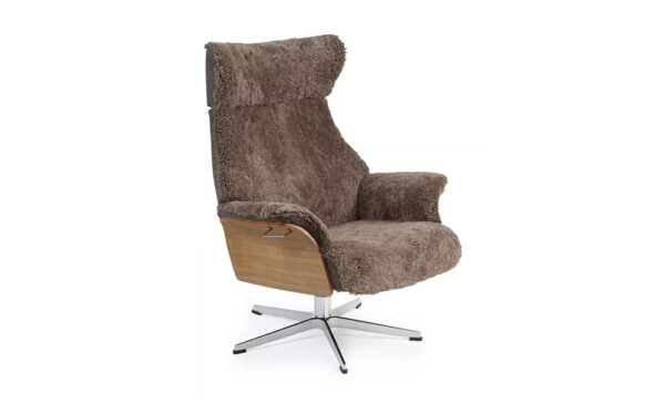 Fåtölj Air med snurrfunktion och ställbar rygg. En riktigt bekväm fåtölj i en tidlös design. Här klädd i fårskinn Sahara med balja i ekfanér och snurrfot i formgjuten aluminium.