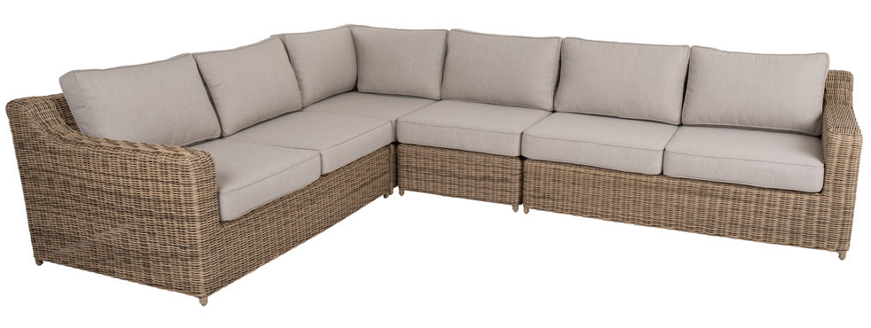 Klassisk möbel i rund konstrotting med rustikt utseende. Generöst sittutrymme och alldeles lagom lutning gör att du vill koppla av länge. Varmt beigefärgade dynor ingår. Tack vare de olika delarna kan du komponera just den grupp som passar din uteplats, med Glendon kan du verkligen förlänga hemmet utåt.