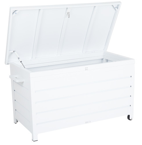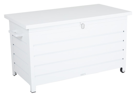 Dynlåda av aluminium. Med sitt plana lock är lådan det perfekta förvaringsutrymmet och hjulen på ena sidan gör den lätt att flytta till en annan plats. I denna förvaringsbox kan man förvara allt från dynor, barnens uteleksaker, trädrådsverktyg och mycket annat.