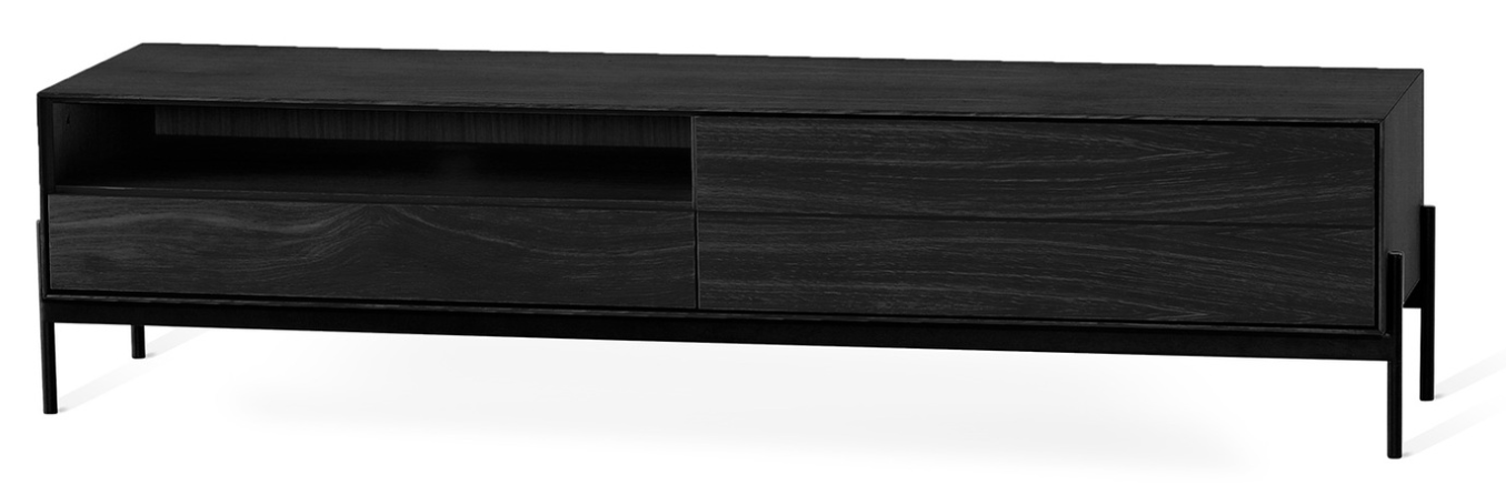 Cane mediabänk 184 cm har två lådor med pushfunktion och ett öppet fack som är förberett för kabelgenomdragning. Materialet är fanerad ek som är svartbetsad och som kombineras med ett underrede i svart metall.
