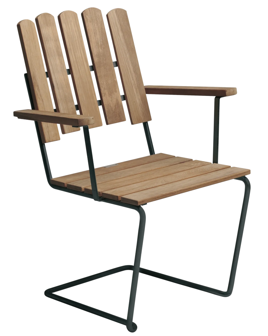 Trotjänaren och kanske det som mest förknippas med Grythyttan Stålmöbler - fåtöljen A2. Designades 1930 av Artur Lindqvist. Har funnits i bersåer, på utomhusserveringar och i trädgårdar sedan dess. Stativet i massivt fjäderstål ger lång livslängd och den rogivande, välkända svikten. Här i oljad ek med stativ i varmförzinkat stål, kombineras med fördel tillsammans med bord 9A eller varför inte som solitär möbel. Varje fåtölj är ett resultat av gediget hantverksarbete, tillverkad av material av högsta kvalitet.