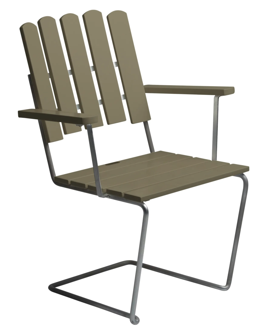 Trotjänaren och kanske det som mest förknippas med Grythyttan Stålmöbler - fåtöljen A2. Designades 1930 av Artur Lindqvist. Har funnits i bersåer, på utomhusserveringar och i trädgårdar sedan dess. Stativet i massivt fjäderstål ger lång livslängd och den rogivande, välkända svikten. Här i oljad ek med stativ i varmförzinkat stål, kombineras med fördel tillsammans med bord 9A eller varför inte som solitär möbel. Varje fåtölj är ett resultat av gediget hantverksarbete, tillverkad av material av högsta kvalitet.