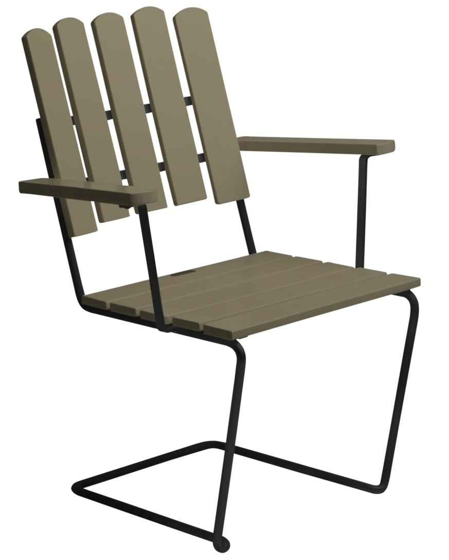 Trotjänaren och kanske det som mest förknippas med Grythyttan Stålmöbler - fåtöljen A2. Designades 1930 av Artur Lindqvist. Har funnits i bersåer, på utomhusserveringar och i trädgårdar sedan dess. Stativet i massivt fjäderstål ger lång livslängd och den rogivande, välkända svikten. Här i oljad ek med stativ i varmförzinkat stål, kombineras med fördel tillsammans med bord 9A eller varför inte som solitär möbel. Varje fåtölj är ett resultat av gediget hantverksarbete, tillverkad av material av högsta kvalitet.