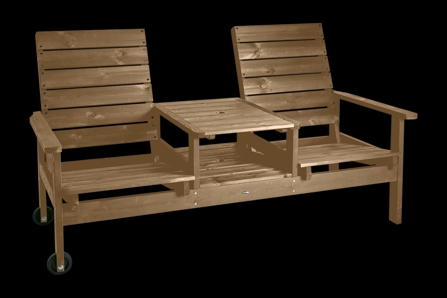 Den klassiska Du&Ja-möbeln för två är ställbar i tre lägen och har hjul för enkel förflyttning. Tillverkad i brunimpregnerad furu. Komplettera med dyna för extra sittkomfort. Hål i bord för parasoll.