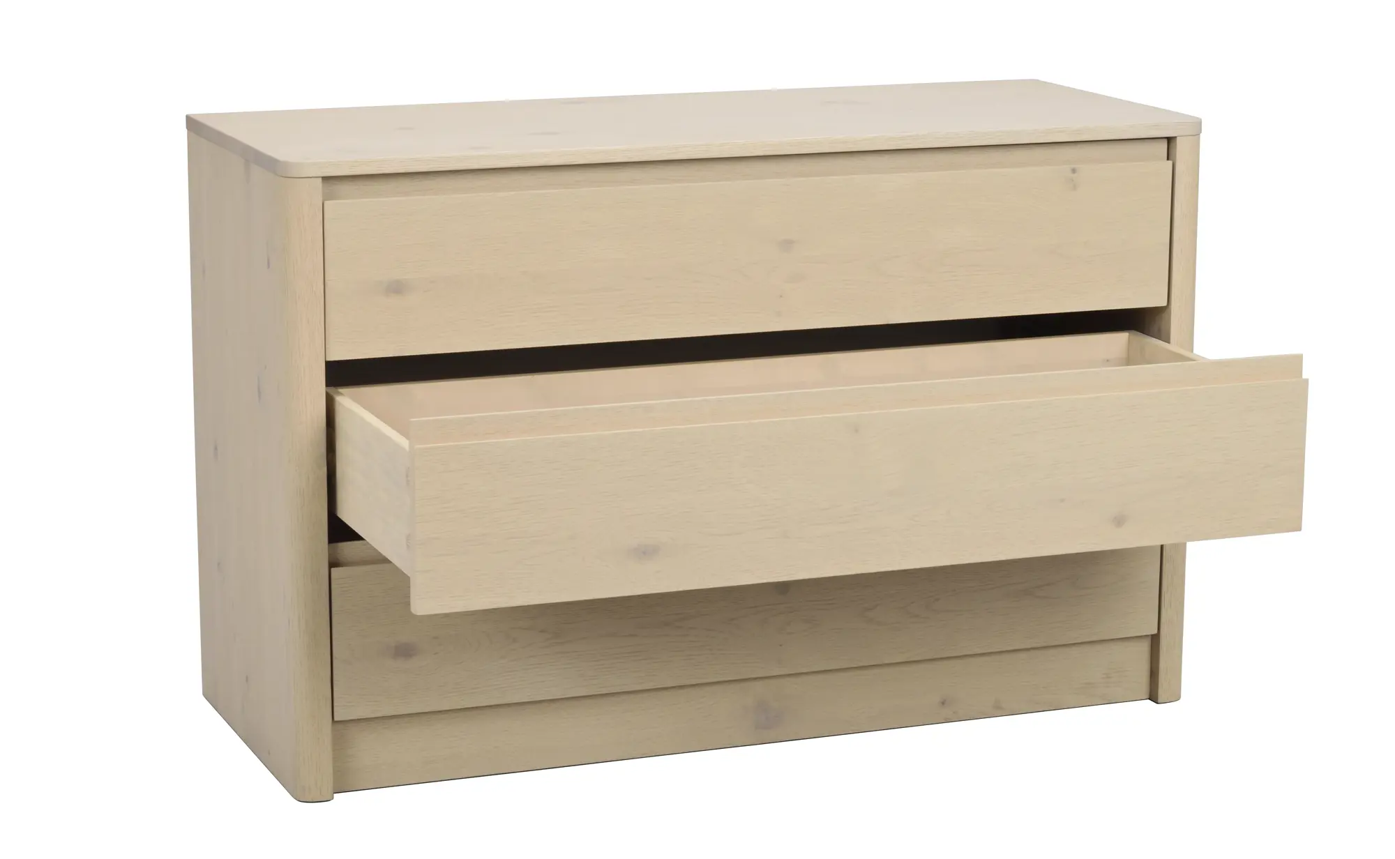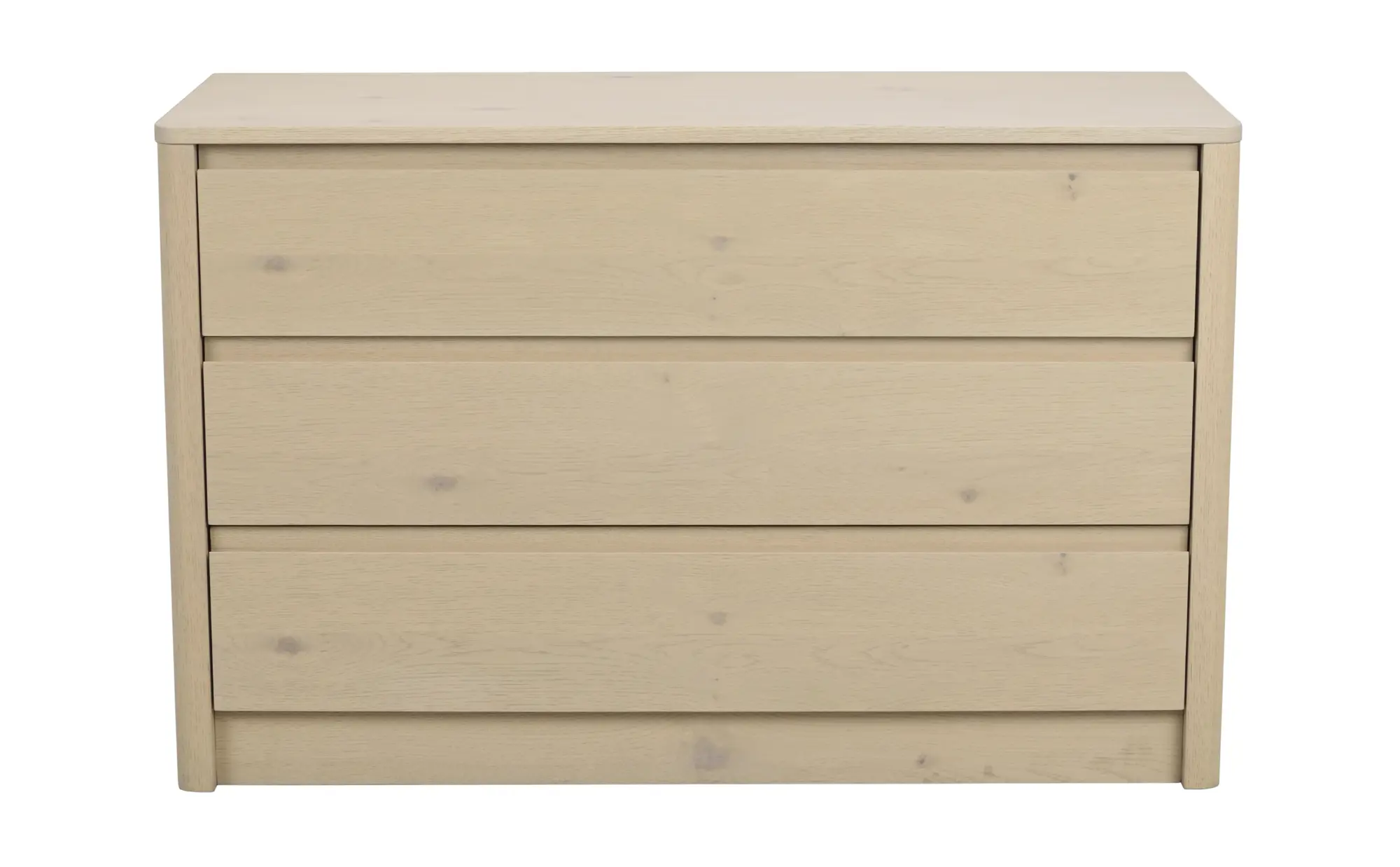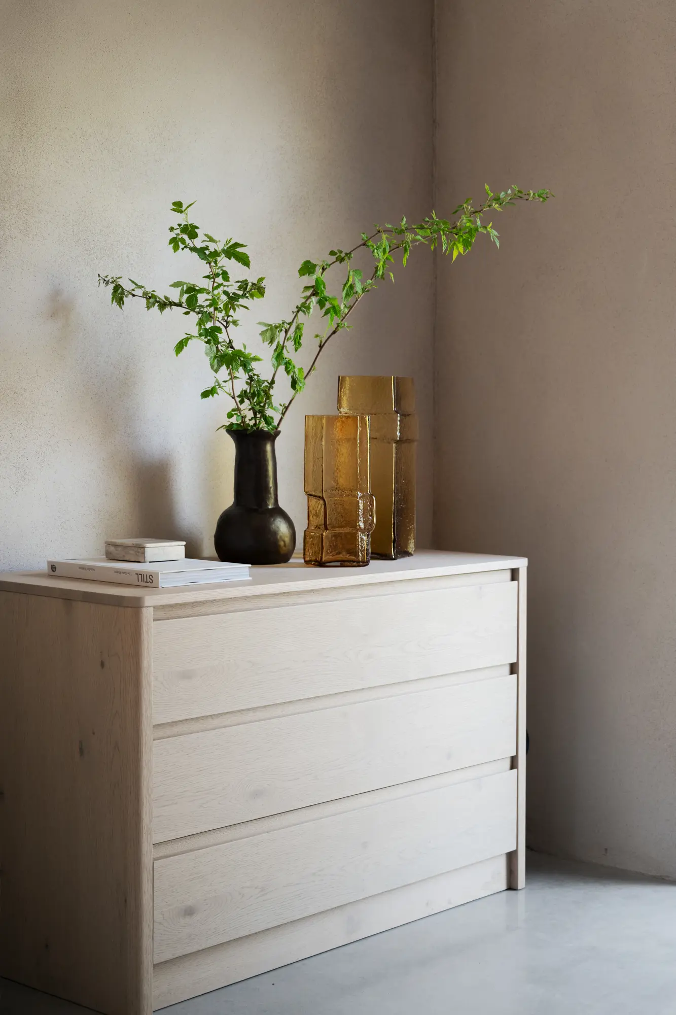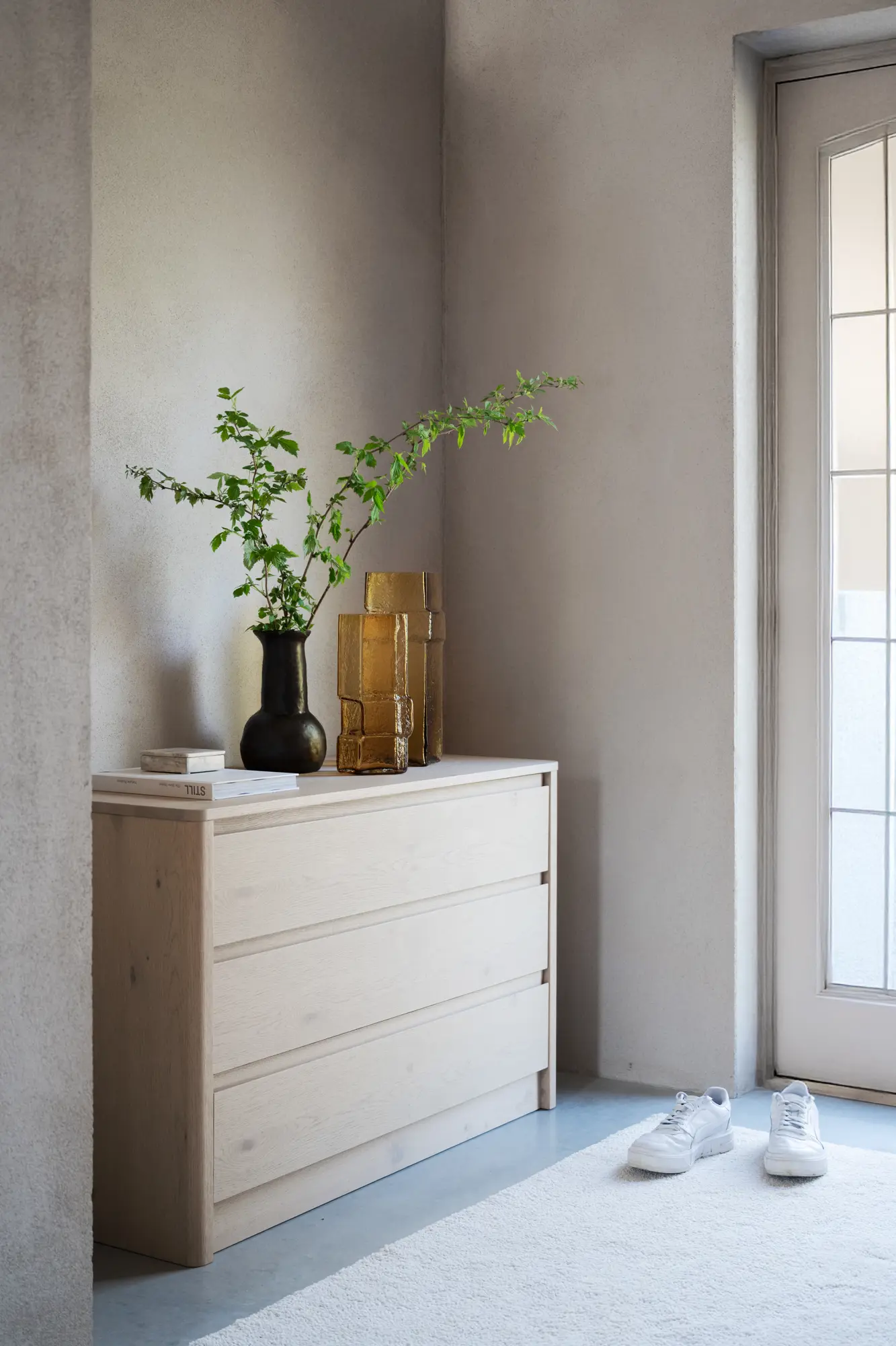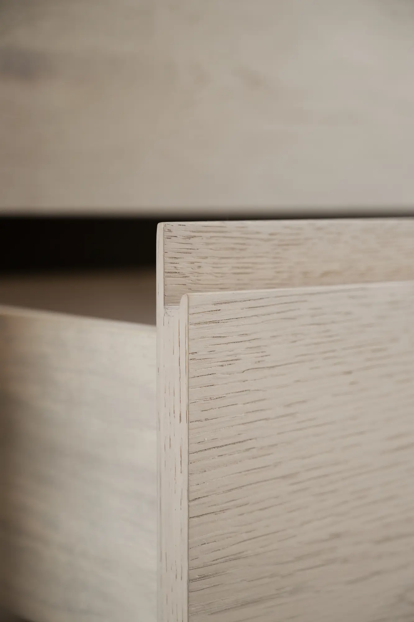 Melstone är en byrå i vitpigmenterad FSC®-certifierad vildek med genomgående hantverkskänsla och mjuka former. Byrån har infrästa handtag i massivt trä, en detalj som både är funktionell och estetiskt tilltalande. Alla delar är fanerade med rundade kanter för ett mjukt och modernt uttryck, och byrån vilar på en upphöjd sarg som ger en lätt, svävande känsla. Den dolda mjukstängande funktionen på lådorna förstärker den genomarbetade känslan.