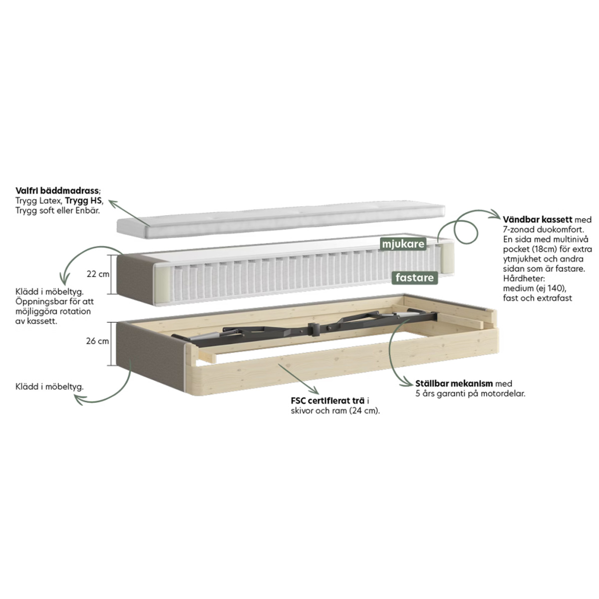 Skogslind erbjuder två komforter i samma madrass. Det vändbara duoresårsystemet har en sida med multilevelpocket som ger en härlig ytmjukhet och en sida som är fastare. Sängen tillverkas i Sverige av gedigna material och hantverksstolthet. En säng med bra avlastning för din kropp så du kan sova tryggt och vakna utvilad. Enkelfjädrad säng med ram med mekanik. Höj- och sänkbar huvud- och fotända. Trådlös fjärrkontroll med Bluetooth, kan även manövreras via app i din smartphone. Integrerad belysning under sängen.