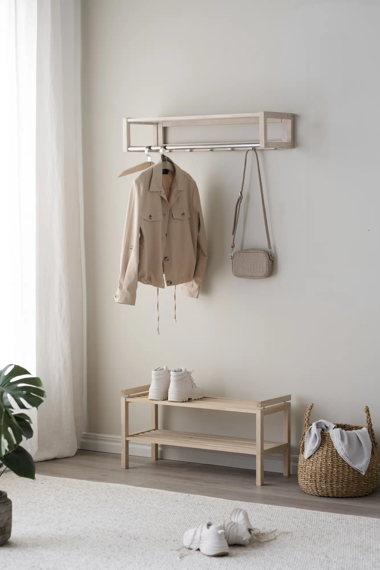 Confetti hatthylla massiv och vitpigmenterad ek. Hatthyllan är både praktisk och modern med snygga krokar i metall. Hatthyllan ingår i hallserien Confetti.