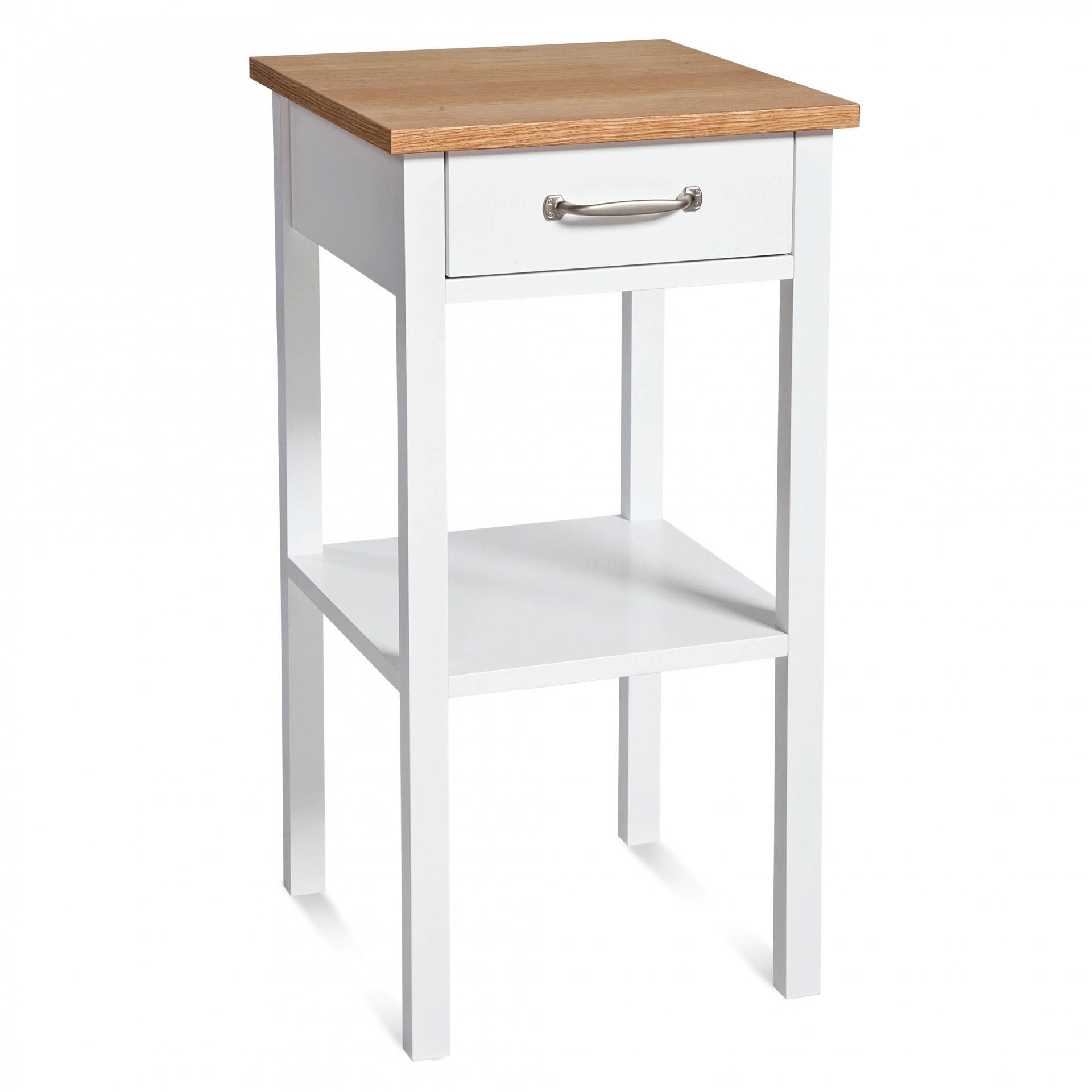 Sängbord Emmaboda, ett sängbord i klassisk modell med låda och hyllplan. I vitlack med topp i oljad ek.