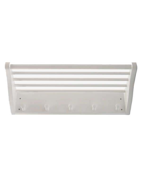 Hatthylla i skandinaviskt och sobert uttryck. Med hylla, klädstång och 5 krokar. Nätt och lättplacerad. Vitlackad björk. Designad av Karl Malmvall.