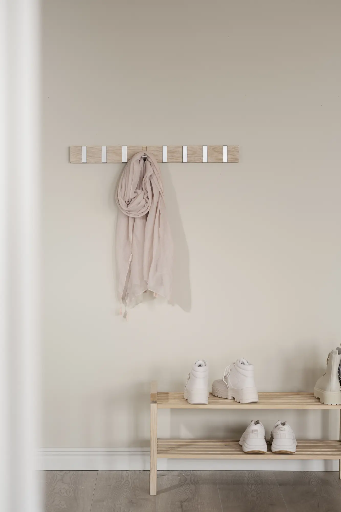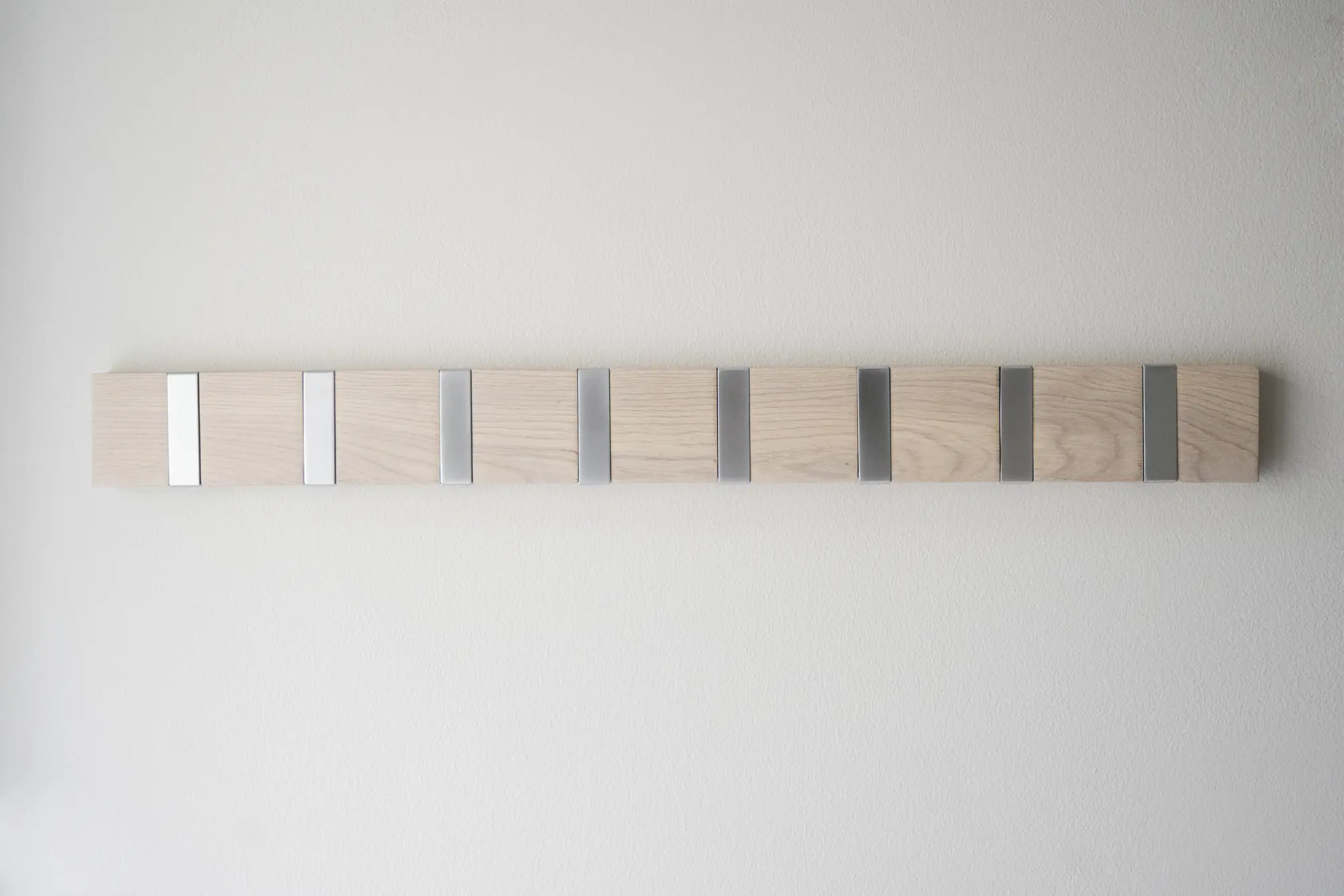 Confetti klädhängare i massiv vitpigmenterad ek. Åtta stilrena och utfällbara metallkrokar. Klädhängaren ingår i hallserien Confetti.