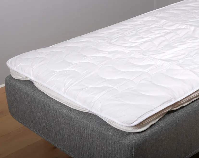 Madrasskydd i bomull, stoppad med bomullsvadd. Resårband i hörnen som håller madrasskyddet på plats.