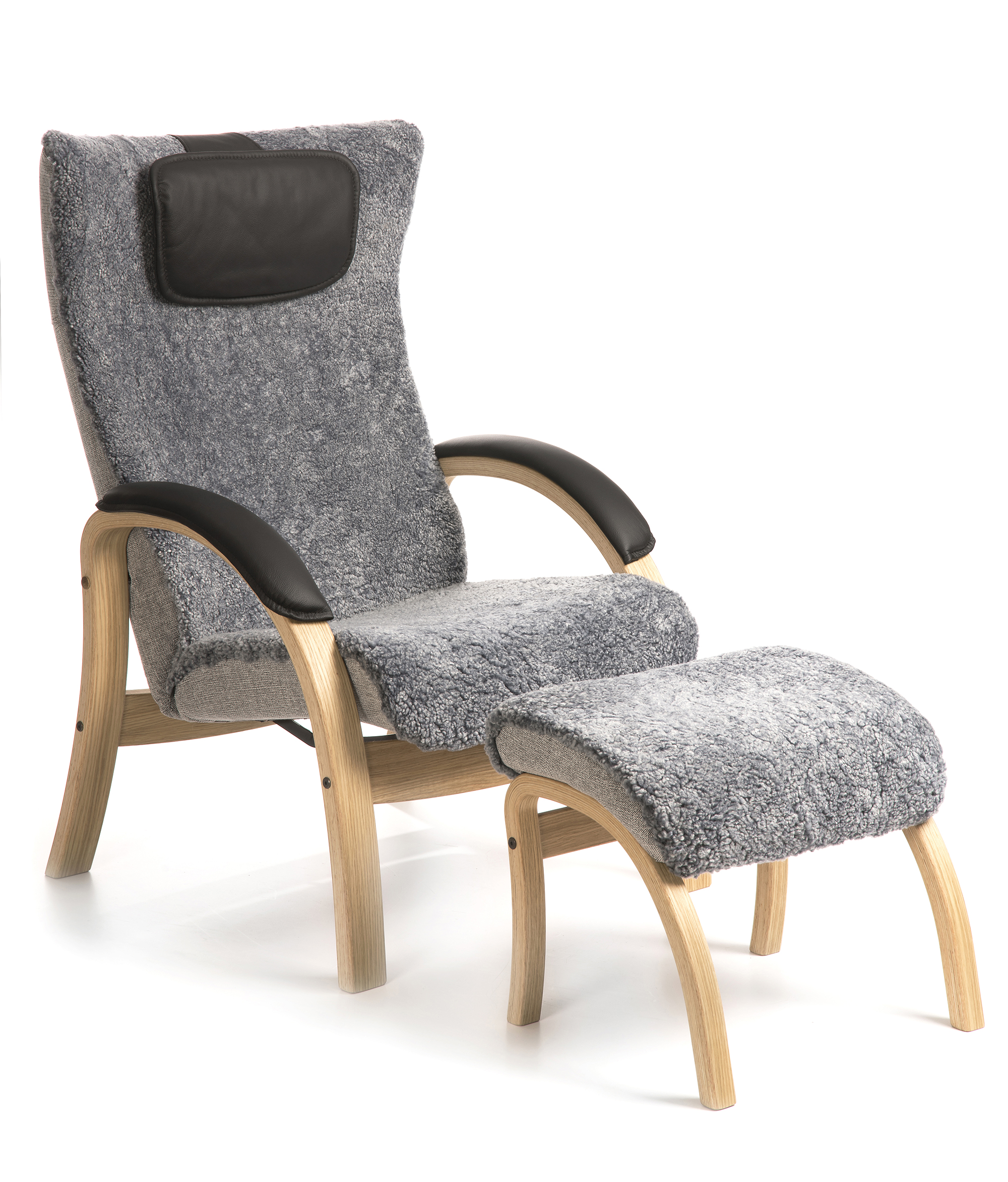 Easy är en klassisk fårskinnsfåtölj med stomme i massiv oljad ek, glidfunktion. Nack- och armstödskuddar i svart läder för extra komfort. I paketet ingår även en matchande fotpall. Från Svenska Conform.