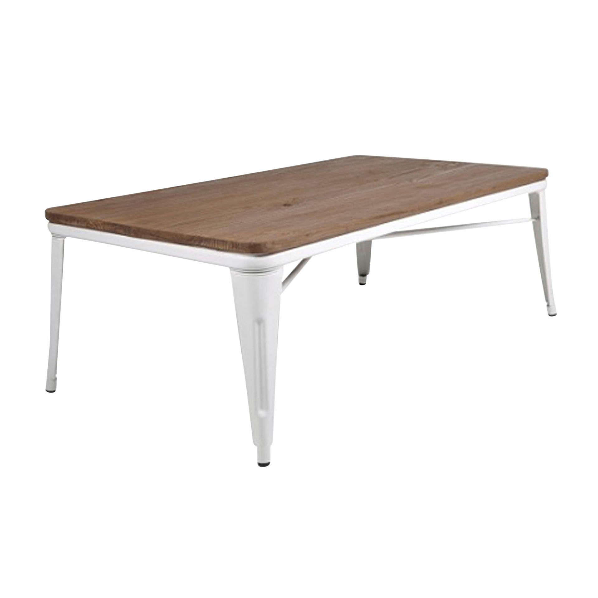 France soffbord med massiv mörkbetsad träskiva och vitt metallunderrede.