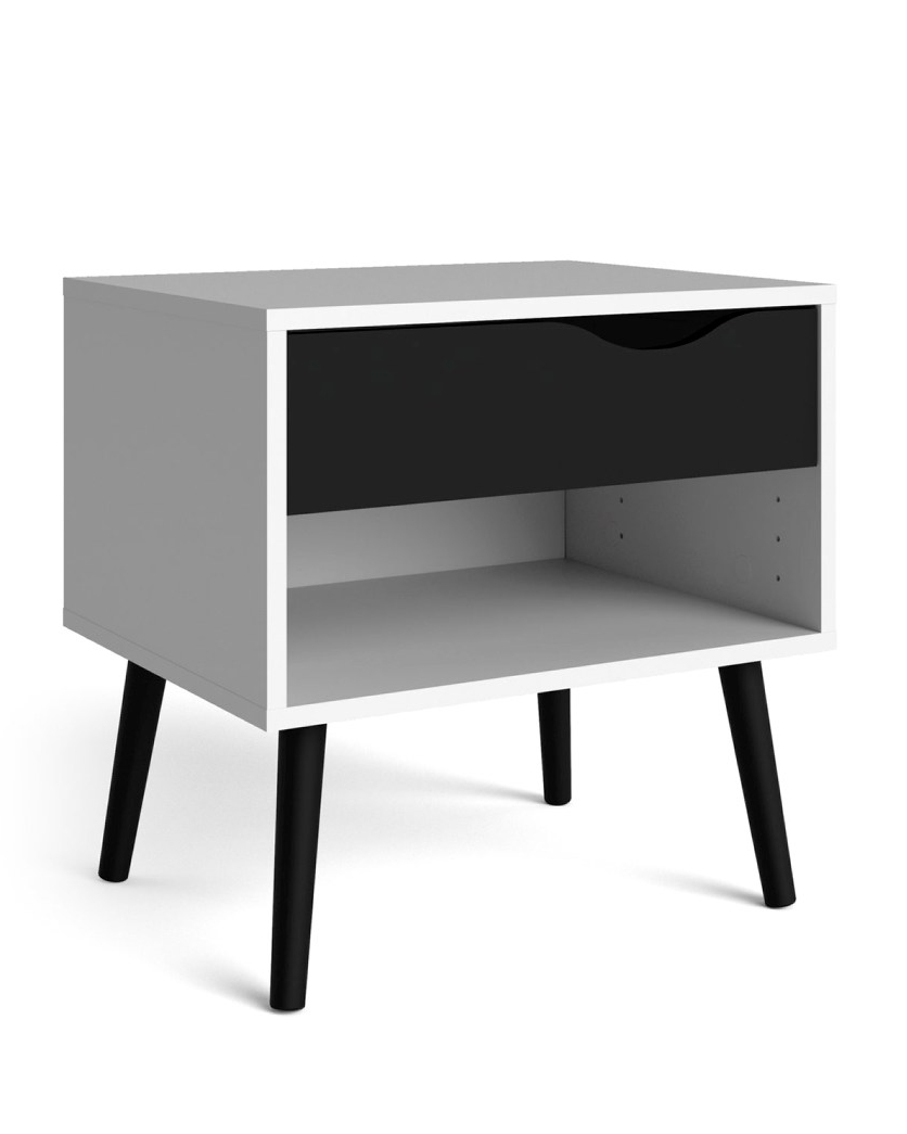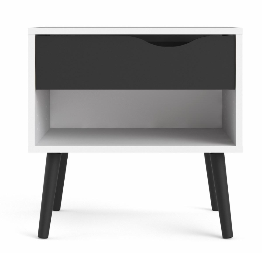 Sängbord i serien Oslo, med låda och hylla. Här i svart/vit.